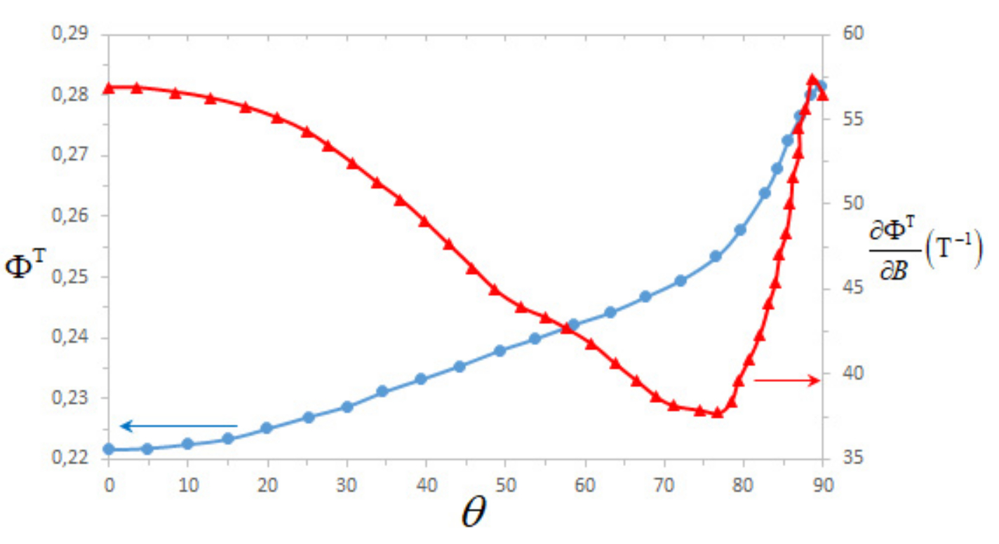 Под действием внешнего магнитного поля и сверхтонкого взаимодействия синглетное состояние электронов радикальной пары испытывает переходы в триплетные состояния и обратно. С учетом возможных спиновых состояний ядер синглет-триплетные осцилляции реализуются на многих частотах . На рис. 3.6 в качестве примера показаны результаты численного анализа выражения (3.11) для как функции полярного угла внешнего магнитного поля .
