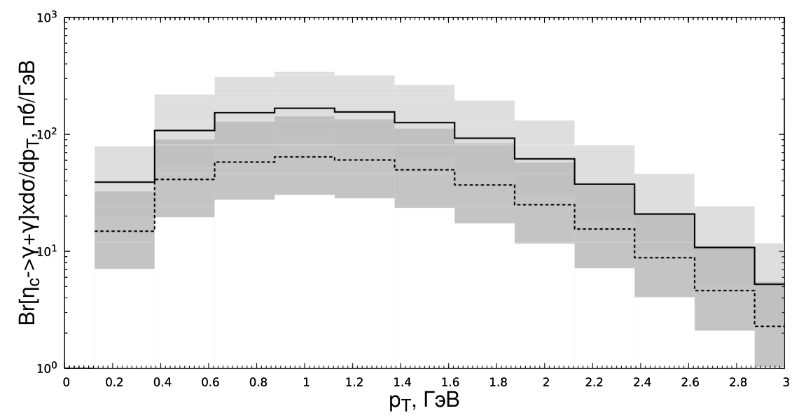 Рис. 4.2. Дифференциальное сечение рождения ηc-мезона как функция поперечного импульса при энергии √s=27 ГэВ, |y|<3, pT<3 ГэВ. Расчет выполнен в ОПМ. Сплошная кривая – в МЦС, пунктирная — в МИЦ. Серым выделены области неопределенности расчетов в зависимости от выбора жесткого масштаба
