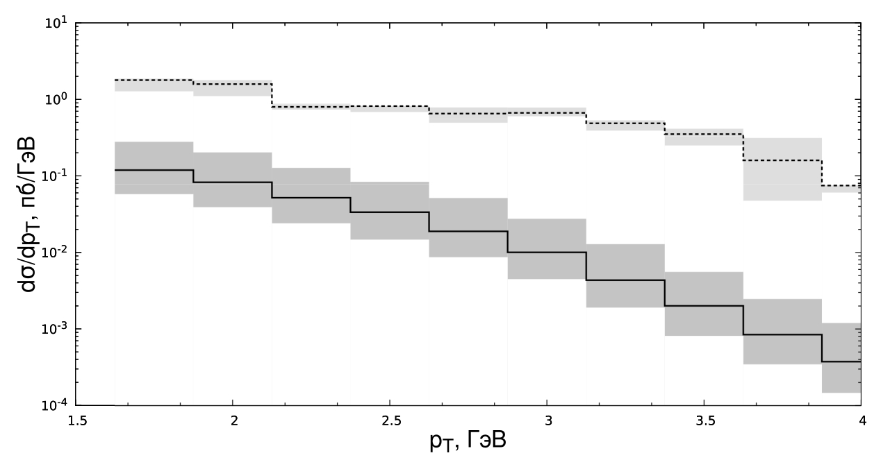 Рис. 4.1. Дифференциальное сечение рождения ηc-мезона как функция поперечного импульса при энергии √s=27 ГэВ, |y|<3, pT<3 ГэВ. Расчет выполнен в МЦС. Сплошная кривая – в ОПМ, пунктирная – в КПМ. Серым выделены области неопределенности расчетов в зависимости от выбора жесткого масштаба