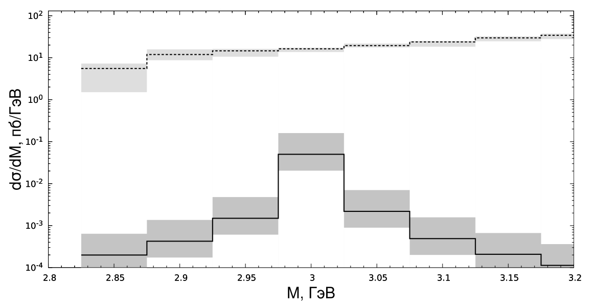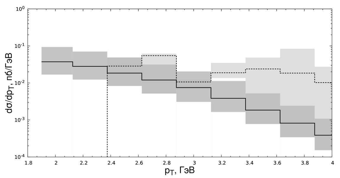 Проведен расчет дифференциального сечения рождения в протон-протонных столкновениях -мезона по поперечному импульсу в МЦС как в ОПМ, так и в КПМ. На рис. 4.1 показан спектр -мезонов по поперечному импульсу. Центральные кривые (сплошная и пунктир) получены при выборе жеcткого масштаба , неопределенности расчетов от вариации жесткого масштаба на фактор 2 ограничены корридорами, закрашенными сером цветом. Полученные результаты согласуются с предсказаниями, полученными ранее в подходе реджезации партонов (ПРП) и МЦС [20]. Хорошее согласие с расчетами в ПРП, в котором эффективно учтены высшие поправки по теории возмущений по константе сильного взаимодейсвия, подтверждает правильность нашей оценки сечения рождения -мезона в ОПМ. Полное сечение рождения -мезона, умноженное на бренчинг распада , составляет нбн.
