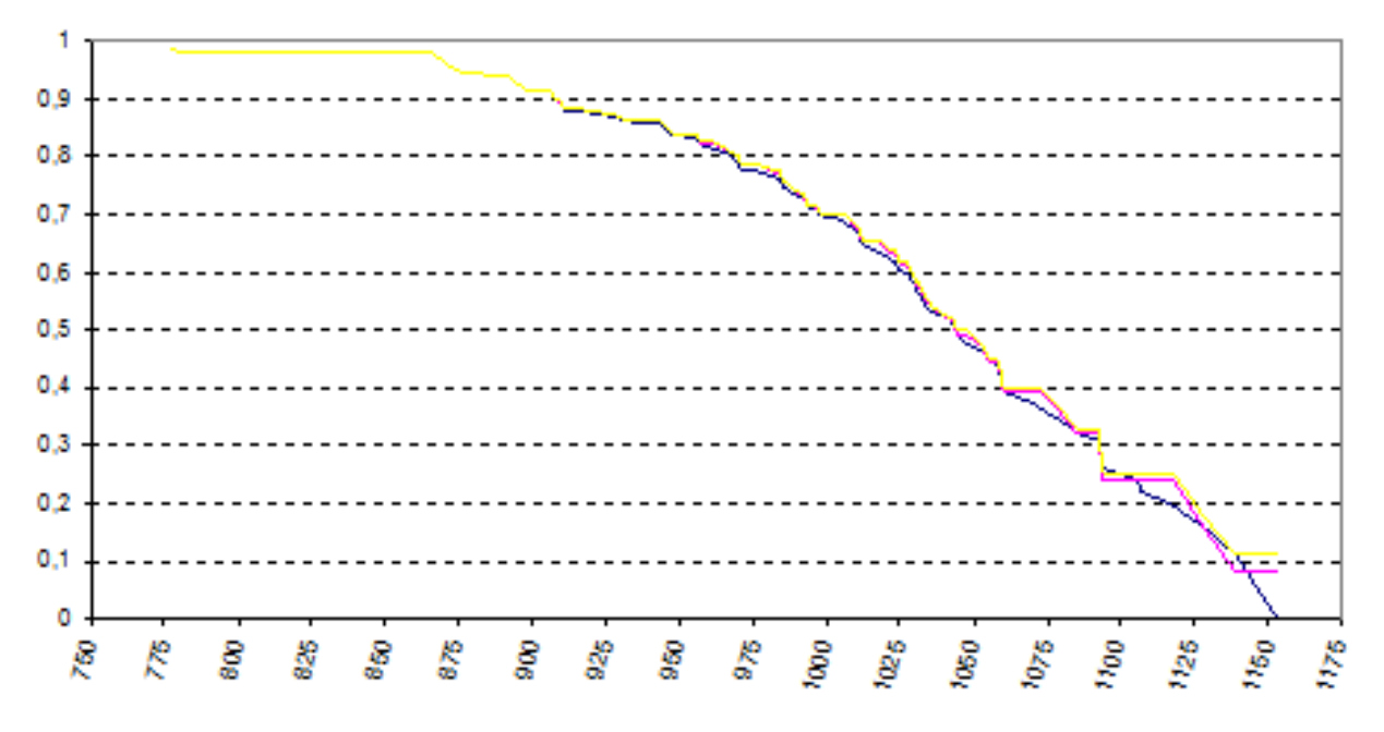 Здесь данные представлены в месяцах, причем находящееся с рядом число 1 MathType@MTEF@5@5@+= feaahGart1ev3aaatCvAUfeBSjuyZL2yd9gzLbvyNv2CaerbuLwBLn hiov2DGi1BTfMBaeXatLxBI9gBaerbd9wDYLwzYbItLDharqqtubsr 4rNCHbGeaGGj0Jf9crFfpeea0xh9v8qiW7rqqrFfpeea0xe9Lq=Jc9 vqaqpepm0xbba9pwe9Q8fs0=yqaqpepae9pg0FirpepeKkFr0xfr=x fr=xb9adbaqaaeGaciGaaiaabeqaamaabaabaaGcbaGaaGymaaaa@38C2@  в парах означает нецензурирование (т. е. смерть), а 0 MathType@MTEF@5@5@+= feaahGart1ev3aaatCvAUfeBSjuyZL2yd9gzLbvyNv2CaerbuLwBLn hiov2DGi1BTfMBaeXatLxBI9gBaerbd9wDYLwzYbItLDharqqtubsr 4rNCHbGeaGGj0Jf9crFfpeea0xh9v8qiW7rqqrFfpeea0xe9Lq=Jc9 vqaqpepm0xbba9pwe9Q8fs0=yqaqpepae9pg0FirpepeKkFr0xfr=x fr=xb9adbaqaaeGaciGaaiaabeqaamaabaabaaGcbaGaaGimaaaa@38C1@   MathType@MTEF@5@5@+= feaahGart1ev3aqatCvAUfeBSjuyZL2yd9gzLbvyNv2CaerbuLwBLn hiov2DGi1BTfMBaeXatLxBI9gBaerbd9wDYLwzYbItLDharqqtubsr 4rNCHbGeaGqiVu0Je9sqqrpepC0xbbL8F4rqqrFfpeea0xe9Lq=Jc9 vqaqpepm0xbba9pwe9Q8fs0=yqaqpepae9pg0FirpepeKkFr0xfr=x fr=xb9adbaqaaeGaciGaaiaabeqaamaabaabaaGcbaqefmuySLMyYL gaiuaajugGbabaaaaaaaaapeGaa8hfGaaa@3A95@  цензурирование. При этом 46 человек умерли с начала открытия центра в 1964 году по 1 июля 1975 года ко дню сбора данных. Это нецензурированные данные. Из остальных данных о 51 человеке 5 были выписаны из центра, а 46 еще были живы к 1 июля 1975 года. Это цензурированные данные. По этим 97 данным приведены графики оценок H m ;97 (x),m=1,2,3 MathType@MTEF@5@5@+= feaahGart1ev3aaatCvAUfeBSjuyZL2yd9gzLbvyNv2CaerbuLwBLn hiov2DGi1BTfMBaeXatLxBI9gBaerbd9wDYLwzYbItLDharqqtubsr 4rNCHbGeaGGj0Jf9crFfpeea0xh9v8qiW7rqqrFfpeea0xe9Lq=Jc9 vqaqpepm0xbba9pwe9Q8fs0=yqaqpepae9pg0FirpepeKkFr0xfr=x fr=xb9adbaqaaeGaciGaaiaabeqaamaabaabaaGcbaGaamisamaaBa aaleaacaWGTbaabeaakmaaBaaaleaacaaI7aGaaGyoaiaaiEdaaeqa aOGaaGikaiaadIhacaaIPaGaaGilaiaayIW7caaMi8UaaGjcVlaad2 gacaaI9aGaaGymaiaaiYcacaaIYaGaaGilaiaaiodaaaa@499F@  на рис. 1 MathType@MTEF@5@5@+= feaahGart1ev3aqatCvAUfeBSjuyZL2yd9gzLbvyNv2CaerbuLwBLn hiov2DGi1BTfMBaeXatLxBI9gBaerbd9wDYLwzYbItLDharqqtubsr 4rNCHbGeaGqiVu0Je9sqqrpepC0xbbL8F4rqqrFfpeea0xe9Lq=Jc9 vqaqpepm0xbba9pwe9Q8fs0=yqaqpepae9pg0FirpepeKkFr0xfr=x fr=xb9adbaqaaeGaciGaaiaabeqaamaabaabaaGcbaqefmuySLMyYL gaiuaajugGbabaaaaaaaaapeGaa83eGaaa@3A94@ 3 по отдельности и на рис. 4 вместе: