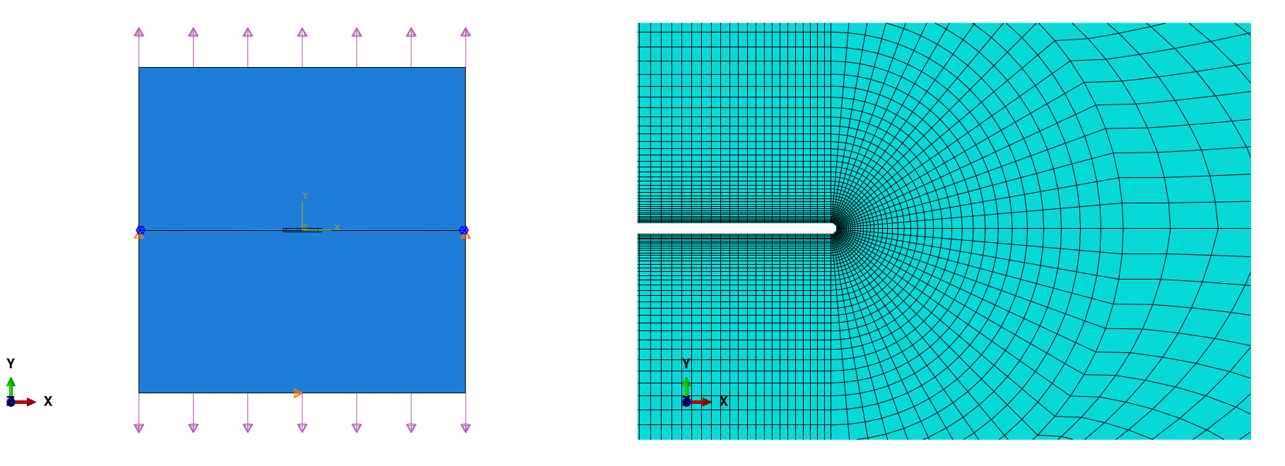 Анализ влияния процесса накопления повреждений на напряженно-деформированное состояние тела был выполнен для конечно-элементной модели пластины с дефектом в виде трещины, подверженной одноосному растяжению усилием .