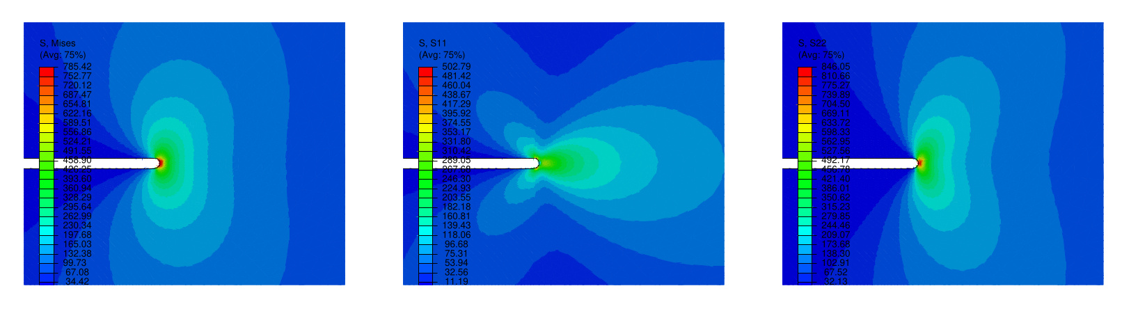 Fig. 2.3. Stress field distribution: stress intensity, σ11 component, σ22 component