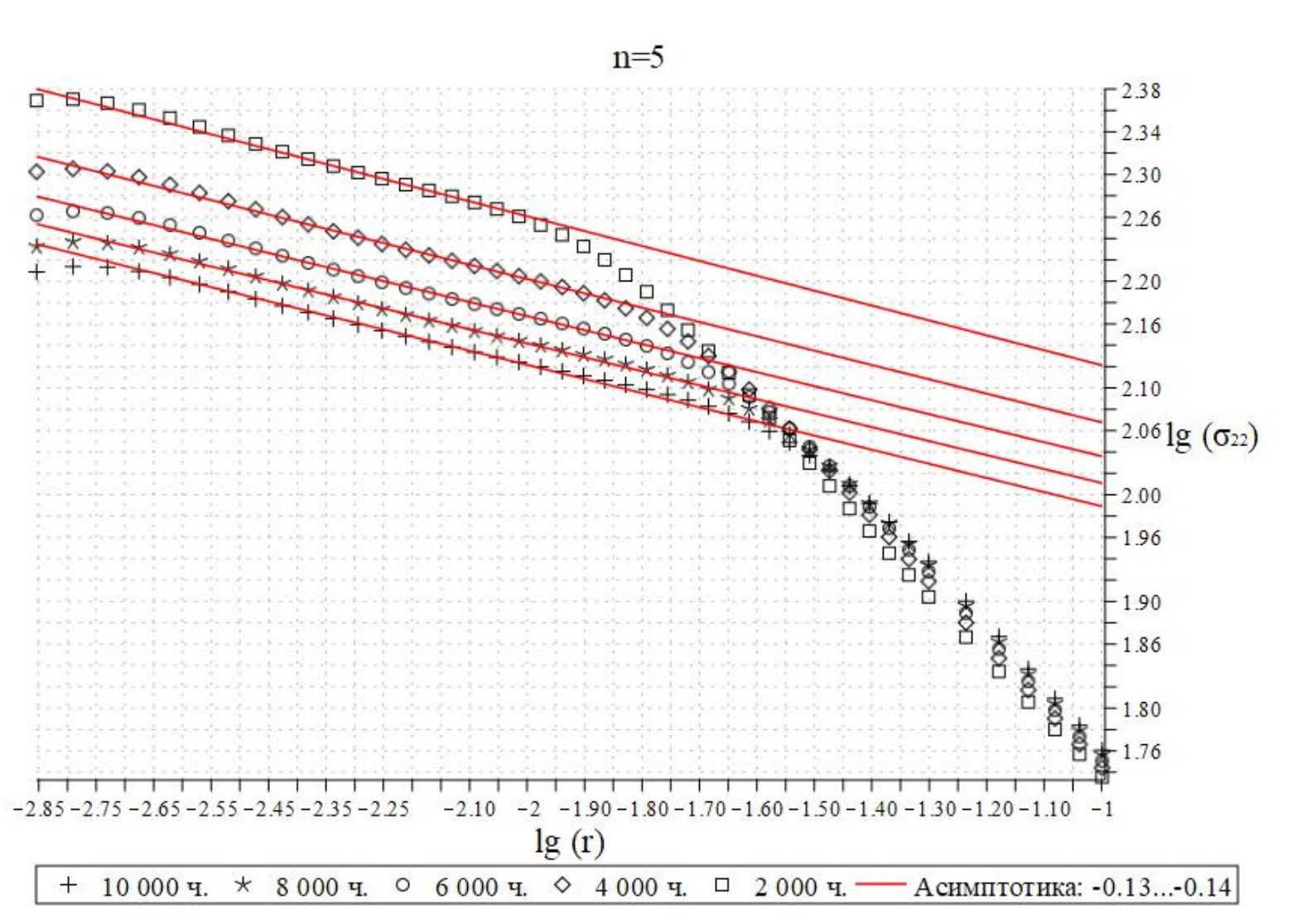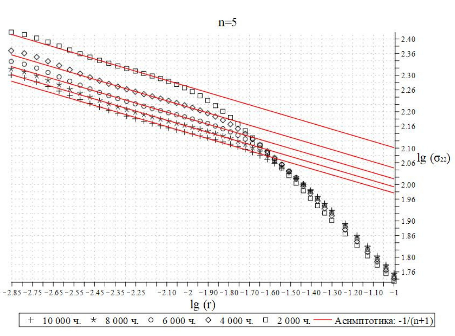 Представим результаты расчетов без учета процесса накопления повреждений. На графиках рис. 3.2-3.4 отображены значения компонент тензора напряжений в двойных логарифмических координатах вдоль назначенного пути для моментов времени 2 000 ч, 4 000 ч, 6 000 ч, 8 000 ч и 10 000 ч для , и . Различными символами обозначены распределения полей напряжений для различных временных точек. Для каждого представленного графика на рис. 3.2-3.4 в зоне ползучести построены прямые сплошные линии-асимптотики, которые аппроксимируют значения компоненты тензора напряжений для каждого расчетного момента. Полученные средние значения коэффициента наклона этих прямых равны значению для соответствующего . Так, для значение коэффициента наклона прямых находится в диапазоне 0.165 – 0.167, для : 0.123 – 0.126 и для : 0.098–0.106. Стоит отметить, что и являются безразмерными величинами напряжений и расстояния, отнесенными соответственно к 1 МПа и 1 мм.
