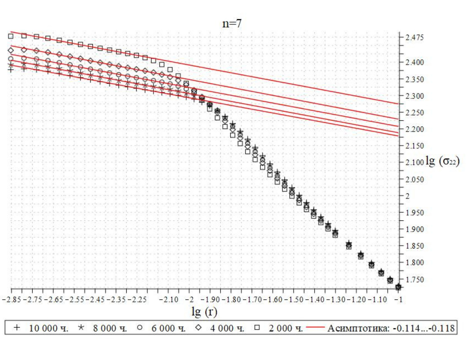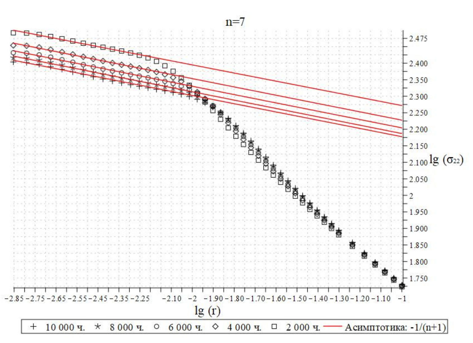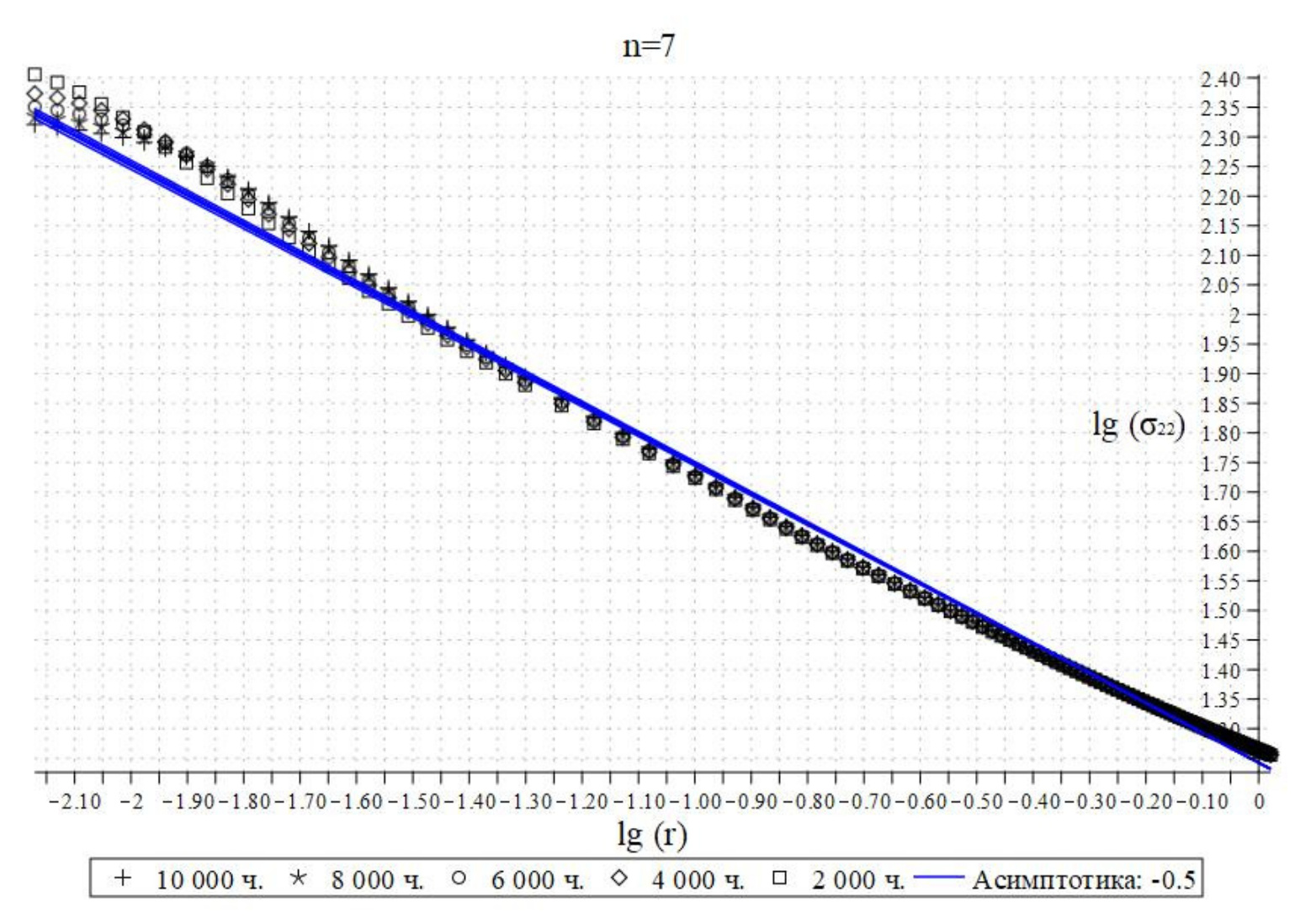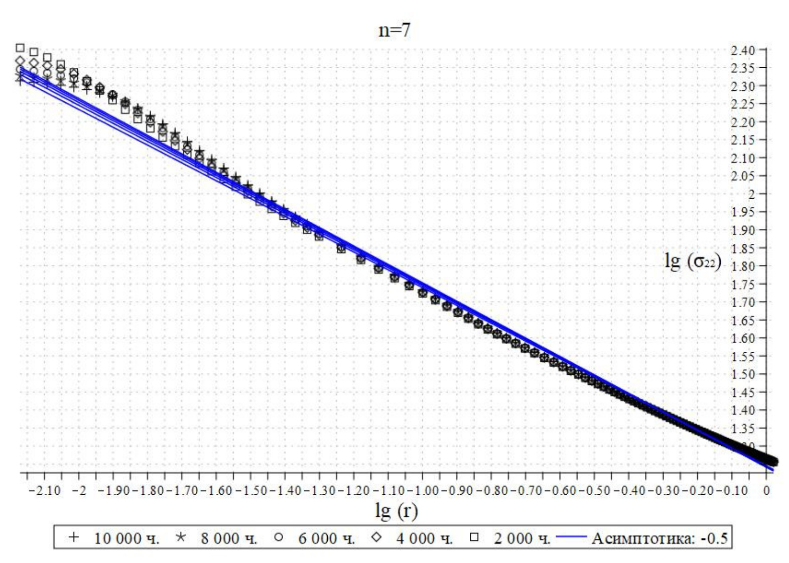 Рис. 3.6. Расчет без учета эффекта накопления повреждений для n=7: распределение компоненты тензора напряжений σ22 для выбранных расчетных точек. Асимптотика в зоне упругости