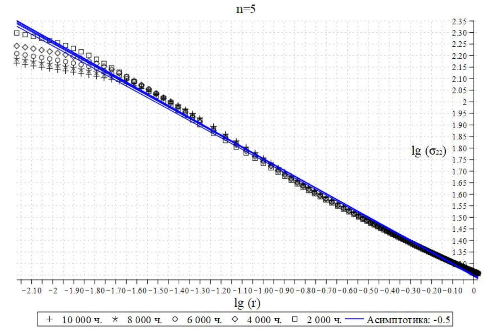 Рис. 3.5. Расчет без учета эффекта накопления повреждений для n=5: распределение компоненты тензора напряжений σ22 для выбранных расчетных точек. Асимптотика в зоне упругости