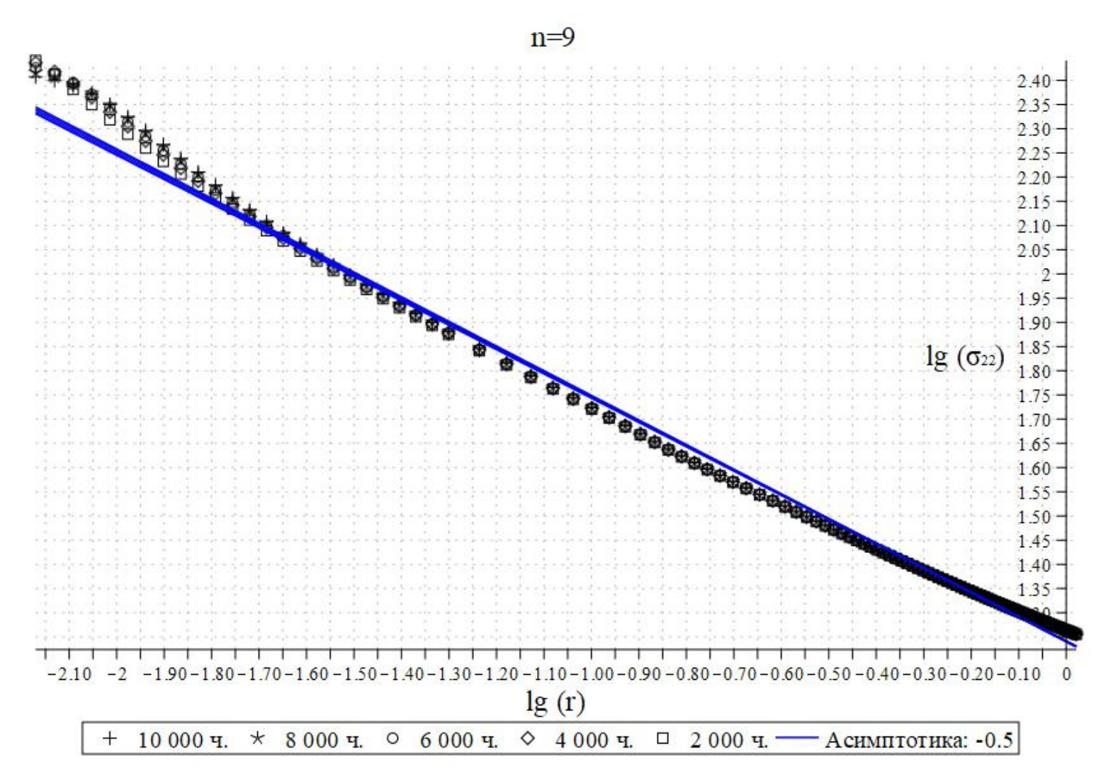 Рис. 3.7. Расчет без учета эффекта накопления повреждений для n=9: распределение компоненты тензора напряжений σ22 для выбранных расчетных точек. Асимптотика в зоне упругости