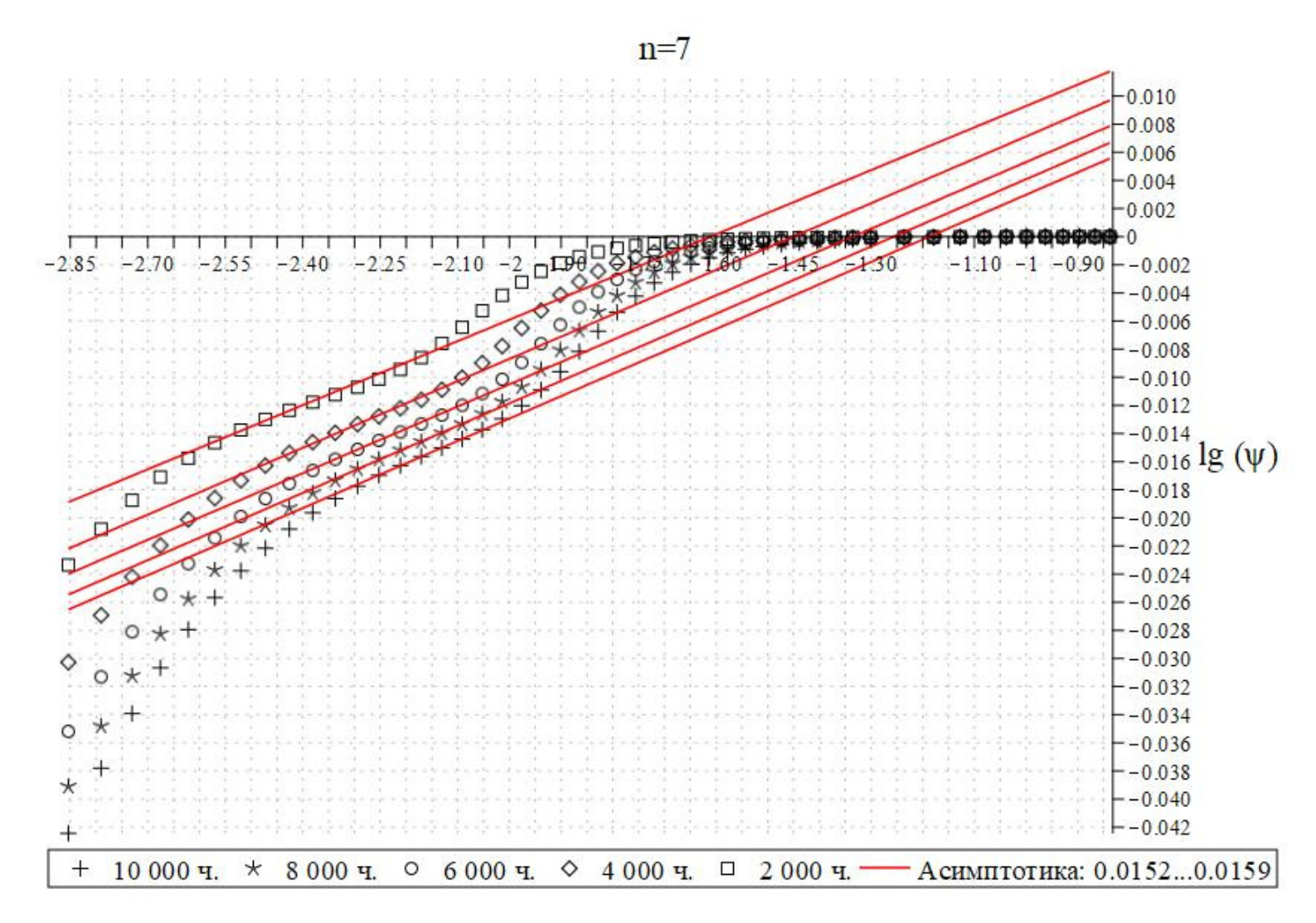 Рис. 3.14. Расчет с учетом эффекта накопления повреждений для n=7: распределение сплошности ψ для выбранных расчетных точек. Асимптотика в зоне I