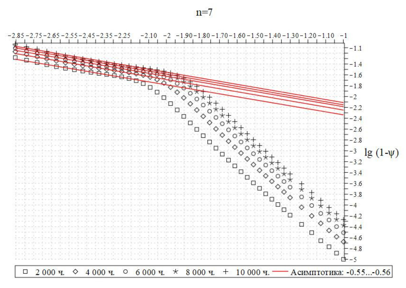 Рис. 3.16. Расчет с учетом эффекта накопления повреждений для n=7: распределение сплошности 1-ψ для выбранных расчетных точек. Асимптотика в зоне II