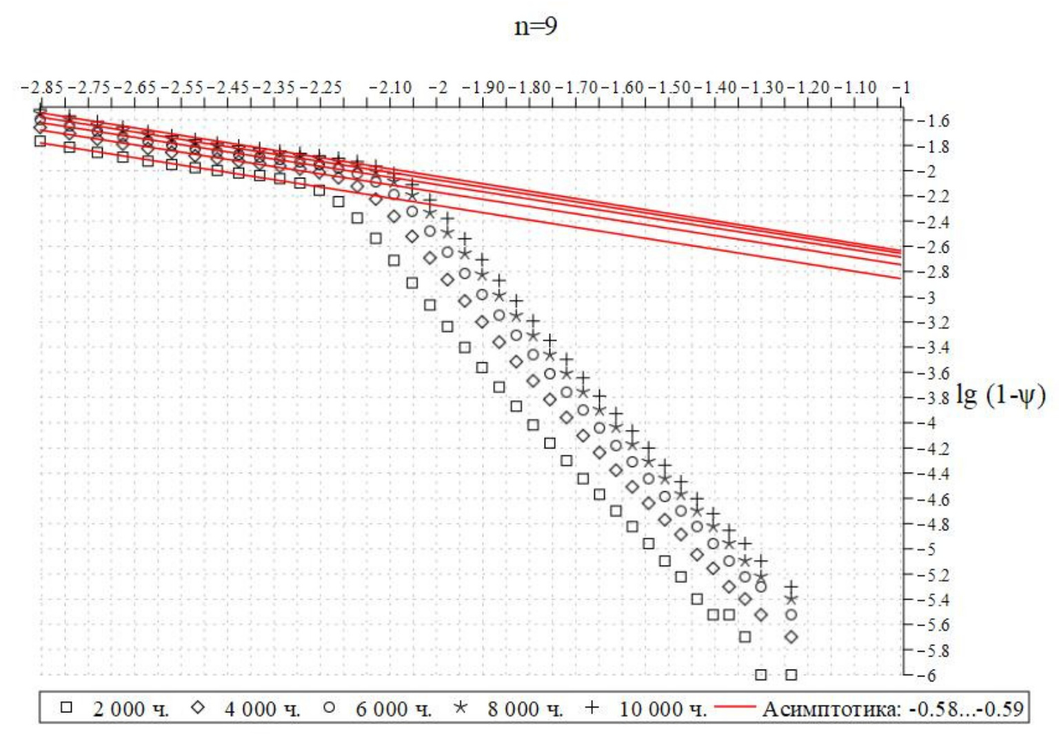 Рис. 3.17. Расчет с учетом эффекта накопления повреждений для n=9: распределение сплошности 1-ψ для выбранных расчетных точек. Асимптотика в зоне II
