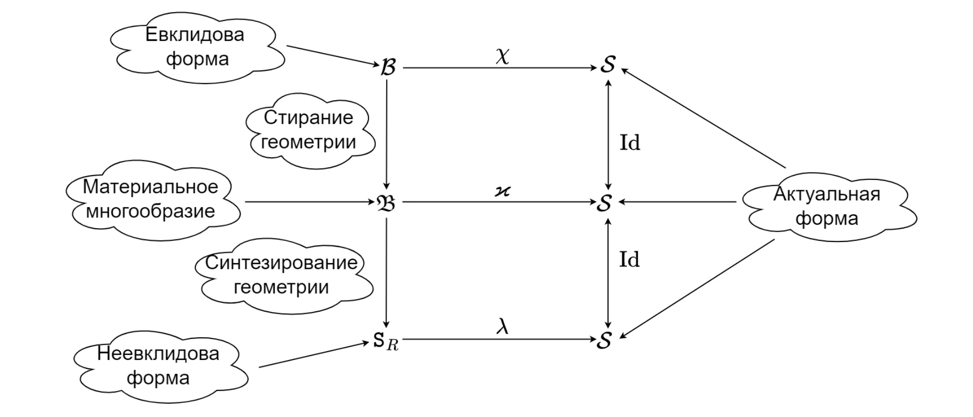 которая также характеризует изменение формы и потому для нее по-прежнему используется термин «деформация». Отметим, что в силу связей, установленных между формами, предполагается, что произвольной можно выбрать любую из пар , и . Третий элемент, соответственно , и , определяется из композиции (2.9).