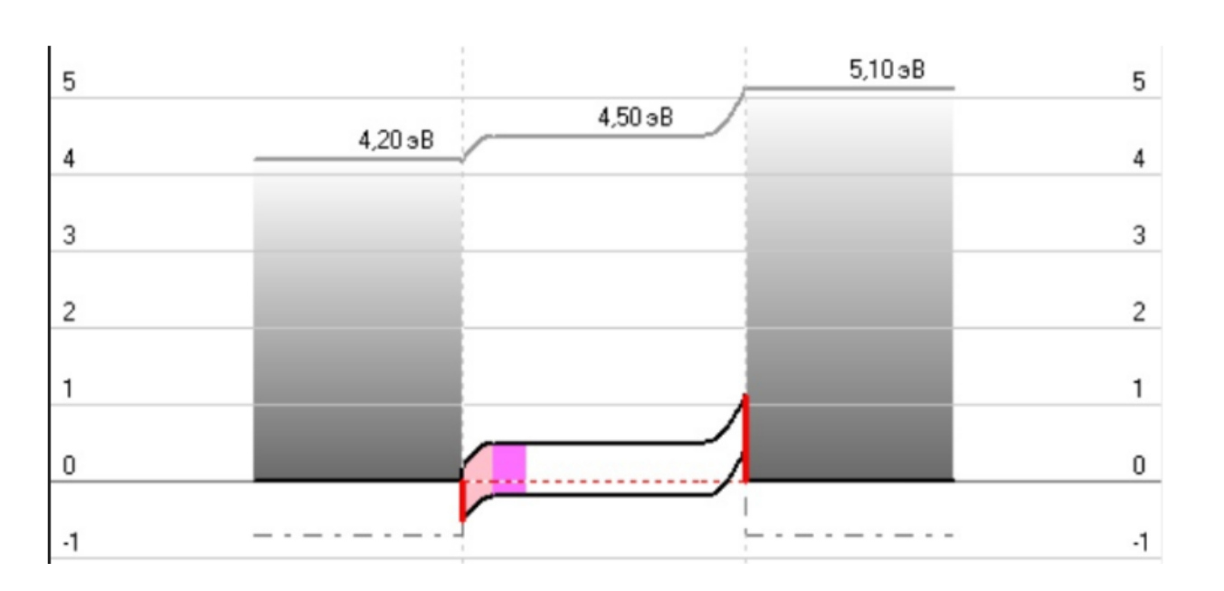 На рис. 3.3–3.7 представлены выборки оптимальных структур гетеропреходов с выращенной пленкой карбида кремния на кремнии с металлизацией. Красной линией показан барьерный переход для соответствующего носителя зарядов, электронов либо дырок.