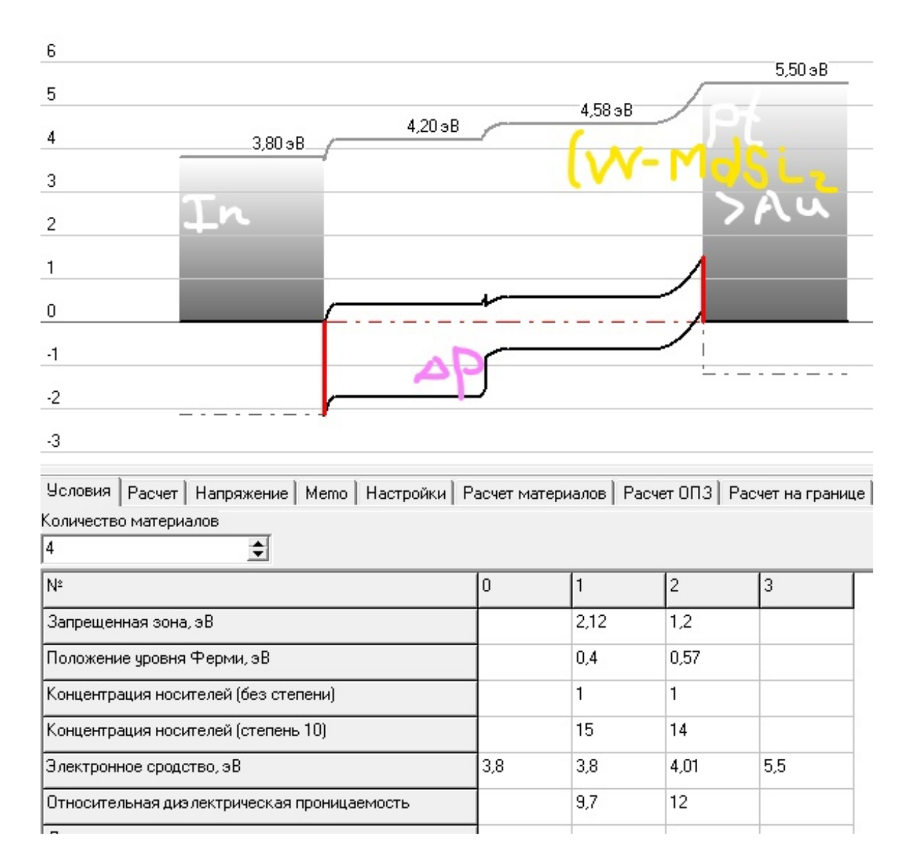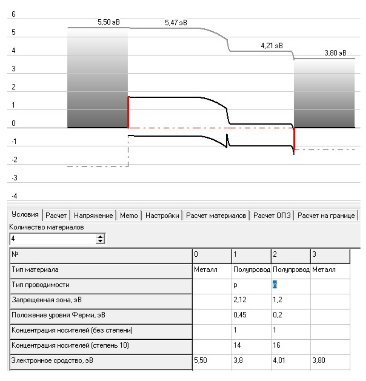 В качестве металлов для контактов были смоделированы ситуации, исходя из данных работ выхода: алюминий (4.2–4.28 эВ), индий (3.60–4.09), золото (4.8–5.17), платина 5.30–5.55, свинец (4.05), бериллий (3.92), неодим (3.3), литий (2.49), кальций, цинк, подлегирование n(p) альфа-германий, хром, силицид молибдена (5–6), дисилицид вольфрама (5–6) и другие. Отмечено, что наиболее эффективными являются структуры вертикальные и планарные с отличающимися от полупроводников работами выхода в большую и меньшую стороны.