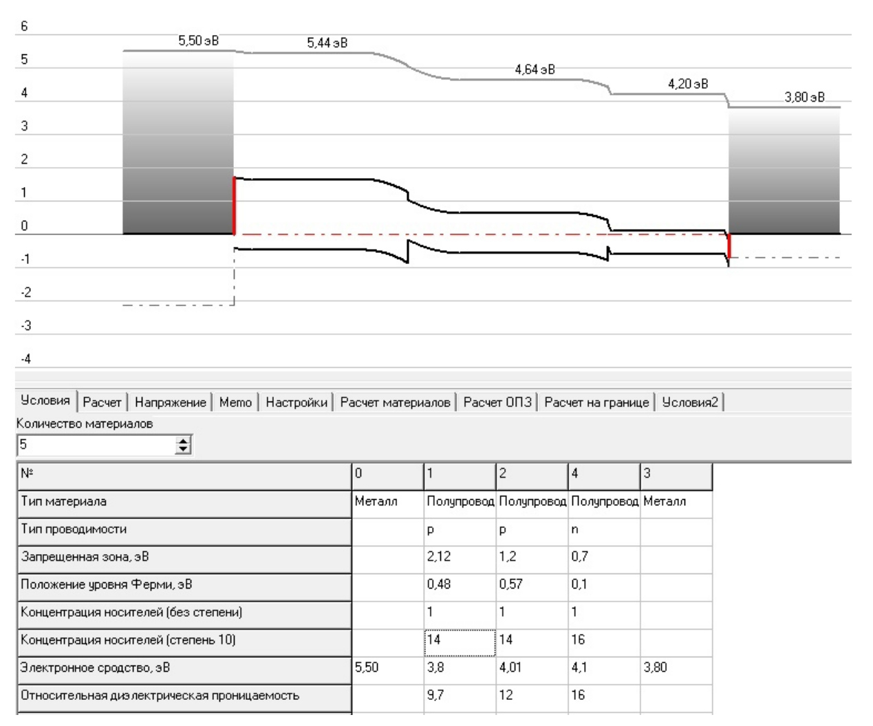 Таким образом покажем, как определяются программным образом задачи построения выборок наиболее подходящих топологий последовательностей гетеропереходов, которые создают наибольшую плотность потока зарядов и безбарьерный переход на металлизацию, с одной стороны, омический — с другой, и накопление заряда в виде 2D Ферми-газа электронов или дырок. Для интерфейса между вычисляемыми параметрами и структурой последовательности гетеропереходов программа, согласно выводному рисунку, комбинирует в материалы инжекторов, металлов, полупроводников в требуемой последовательности в текущем интерактивном режиме практически моментально, которые характеризуются определенными свойствами: диэлектрическая проницаемость, собственная концентрация носителей, концентрации легирования и тип легирования, данные ширин запрещенных зон, электронного сродства, работ выхода полупроводников и металлов, активности инжекторов.