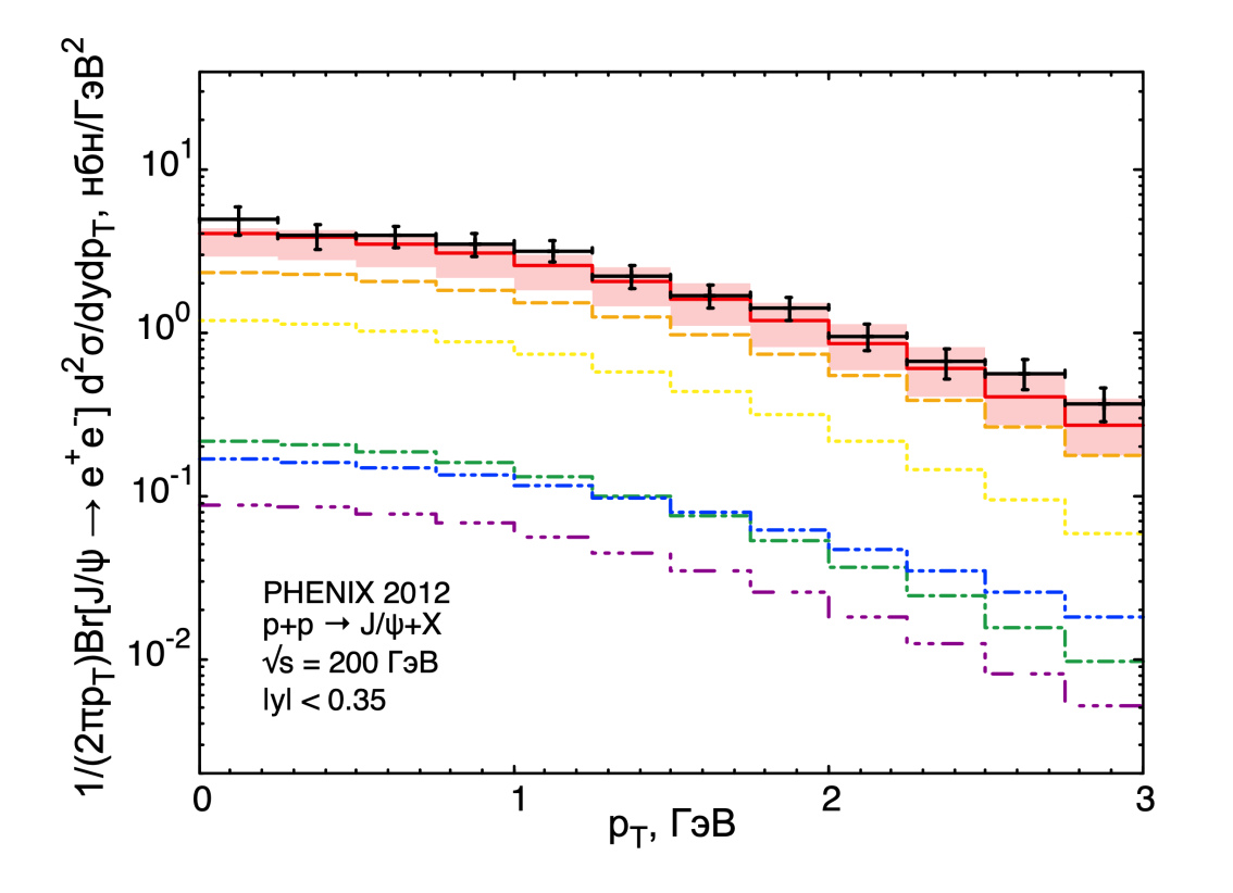 Рис. 3.4. Зависимость дифференциального сечения рождения от поперечного импульса чармония в сравнении с экспериментальными данными коллаборации PHENIX [27]. Показаны вклады от рождения состояний (синяя штриховая линия), (оранжевая штрихпунктирная) и общий не разделяемый фитированием вклад состояний , , (желтая пунктирная). Cумма всех вкладов показана сплошной зеленой линией