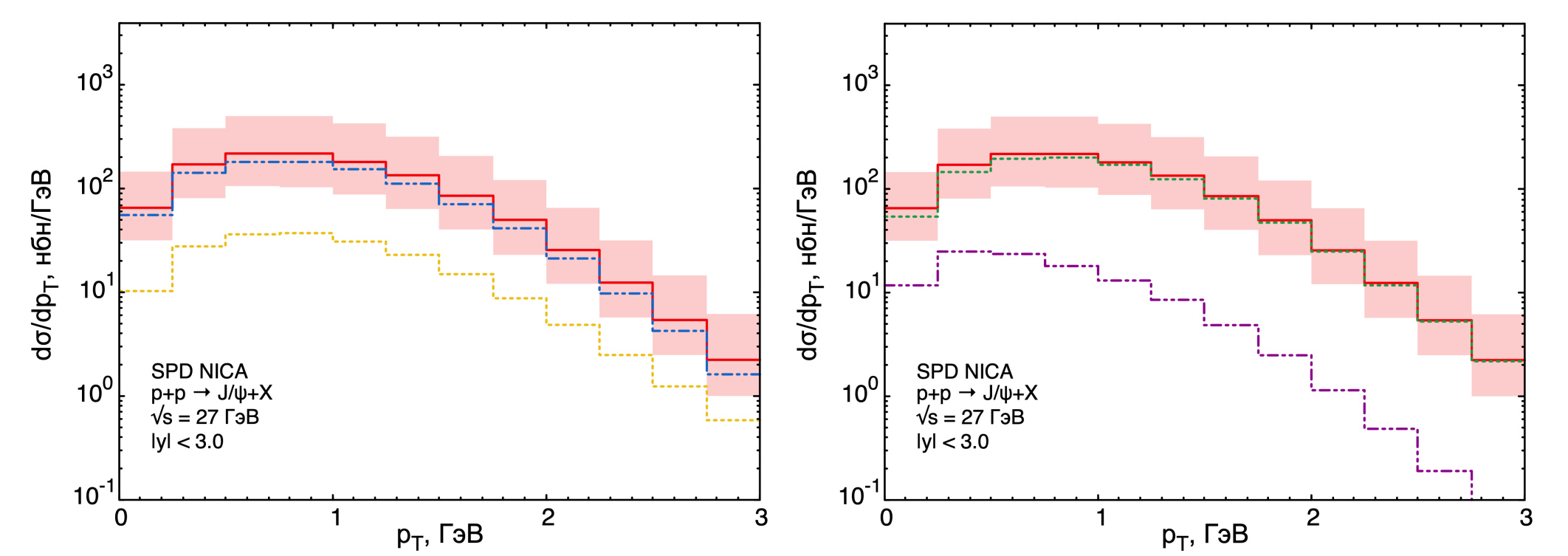 Рис. 3.5. Предсказания зависимости дифференциального сечения рождения от поперечного импульса для эксперимента SPD NICA. Слева показано сравнение полных синглетного (синяя пунктирная линия) и октетного (желтая штрихпунктирная с двумя точками) вкладов в рождение . Справа - сравнение прямого рождения (зеленая пунктирная) и вклада от распадов возбужденных состояний чармония (фиолетовая штрихпунктирная с двумя точками). Красная сплошная линия в обоих случаях отвечает суммарному сечению