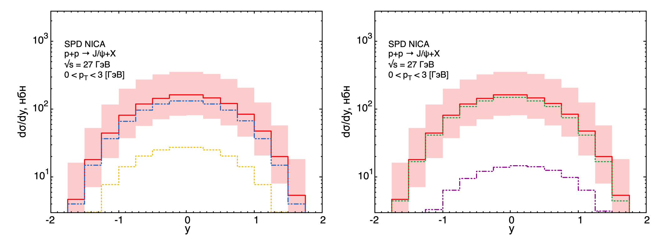 Перейдем к предсказаниям рождения при энергии эксперимента SPD NICA. В расчетах учитывались вклады и использовались параметры, фитированные на данных измерений коллаборации NA3 из-за близости энергии этих двух экспериментов. На рис. 5 и 6 показаны результаты расчетов для дифференциального сечения рождения как функций поперечного импульса и быстроты соответственно.