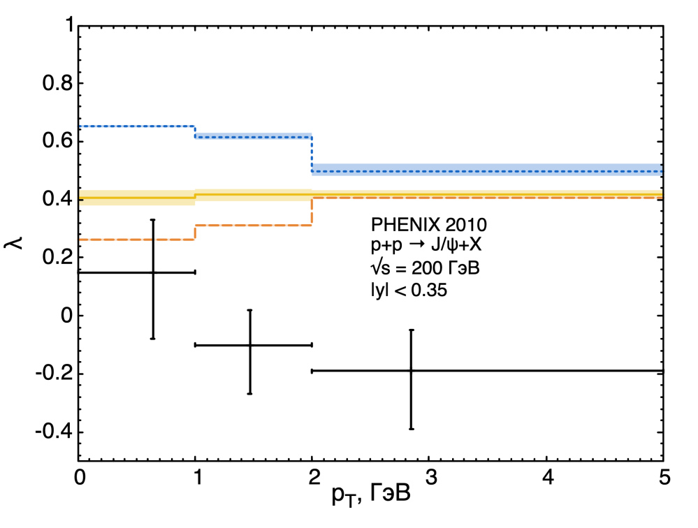 угловой коэффициент выражается через комбинацию сечений продольно и поперечно поляризованных чармониев. Расчеты для данных коллаборации PHENIX по измерению поляризации изображены на рис. 9, построение границ коридора погрешностей для мы осуществляли с помощью следующих выражений [29]: