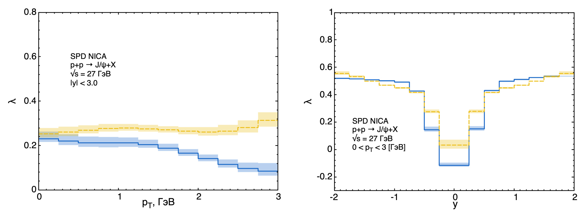 Fig. 3.10. Prediction for (blue solid lines) and (yellow dashed lines) polarization as functions of charmonium transverse momentum (on the left) and charmonium rapidity (on the right) at NICA energy
