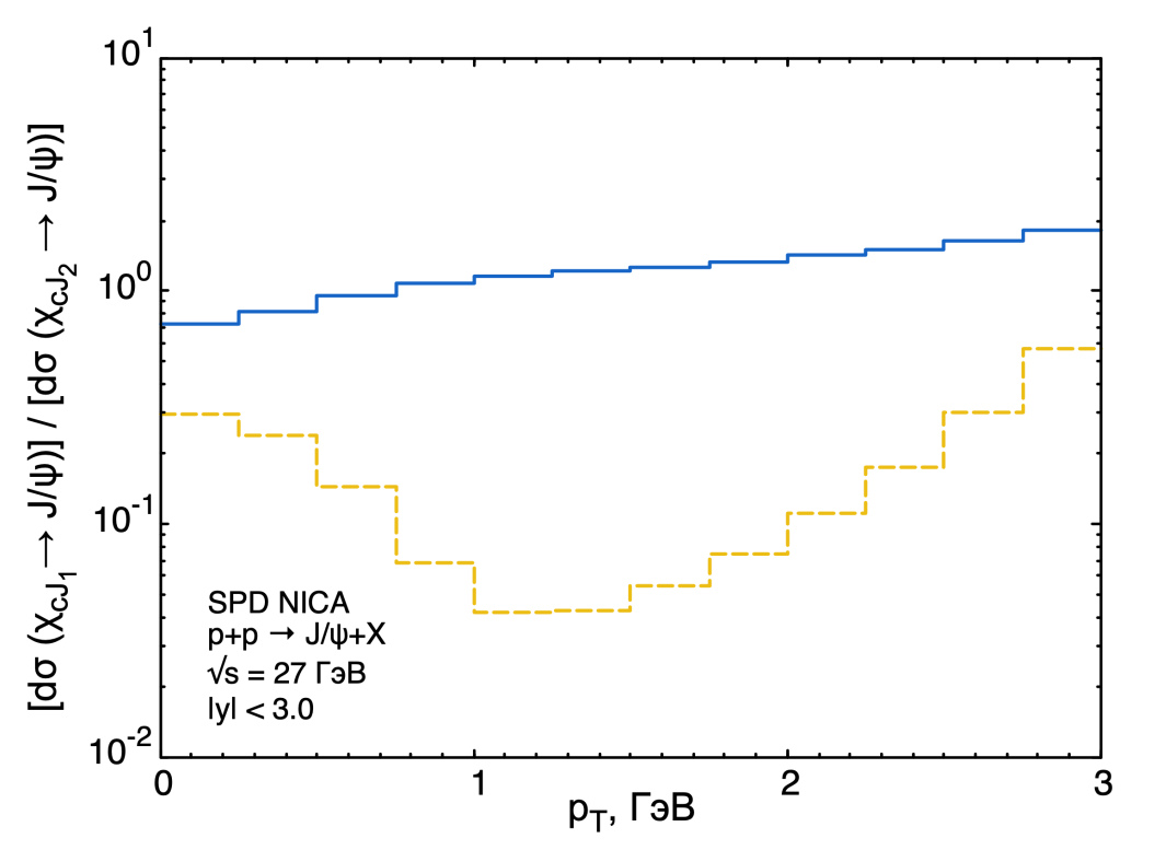 Fig. 3.11. Prediction for ratios of -wave states contributions to the production at NICA energy. Ratios for / (blue solid line) and / (yellow dashed line) are shown