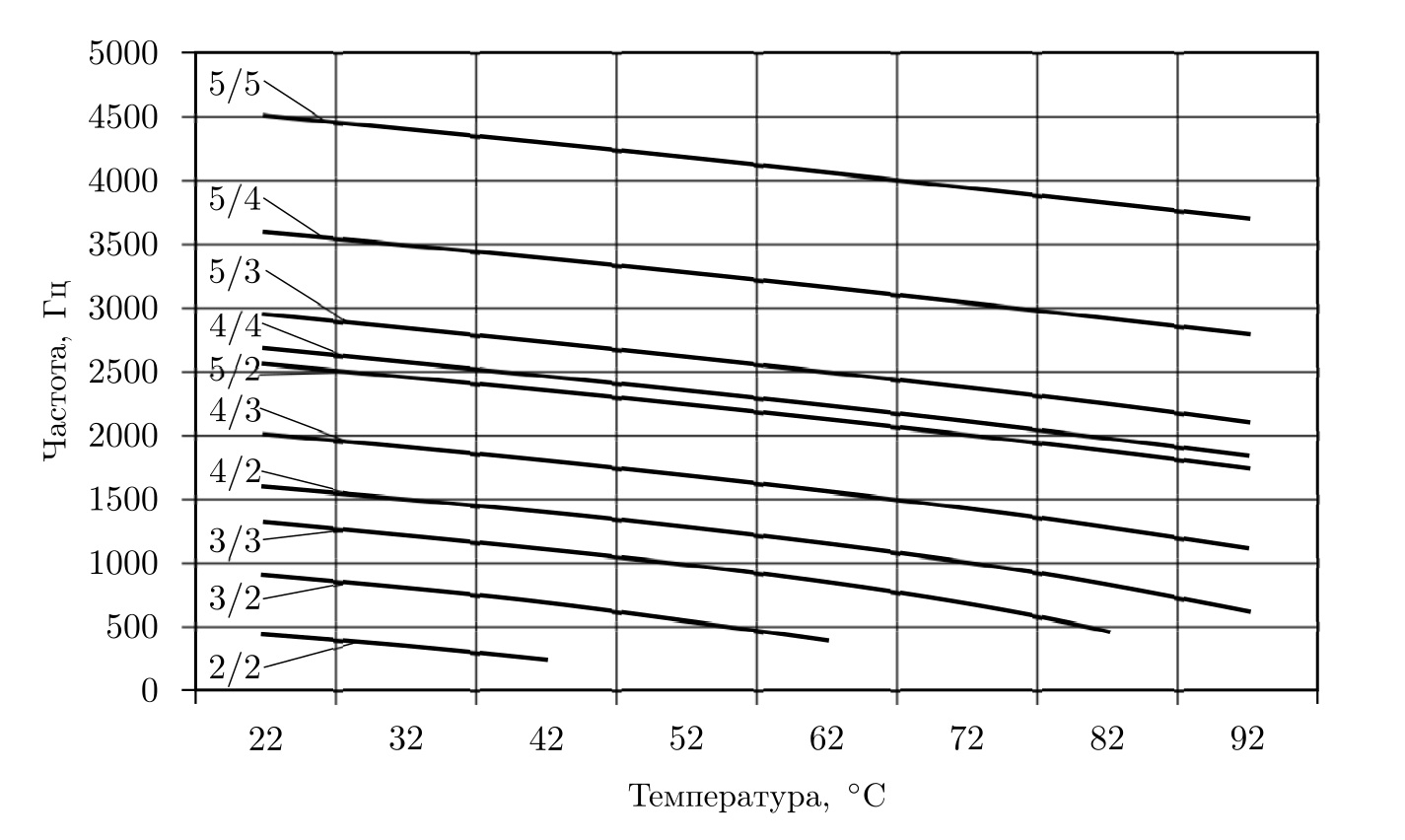 Fig. 2.2. Graphs of frequency changes of oscillation modes with increasing temperature