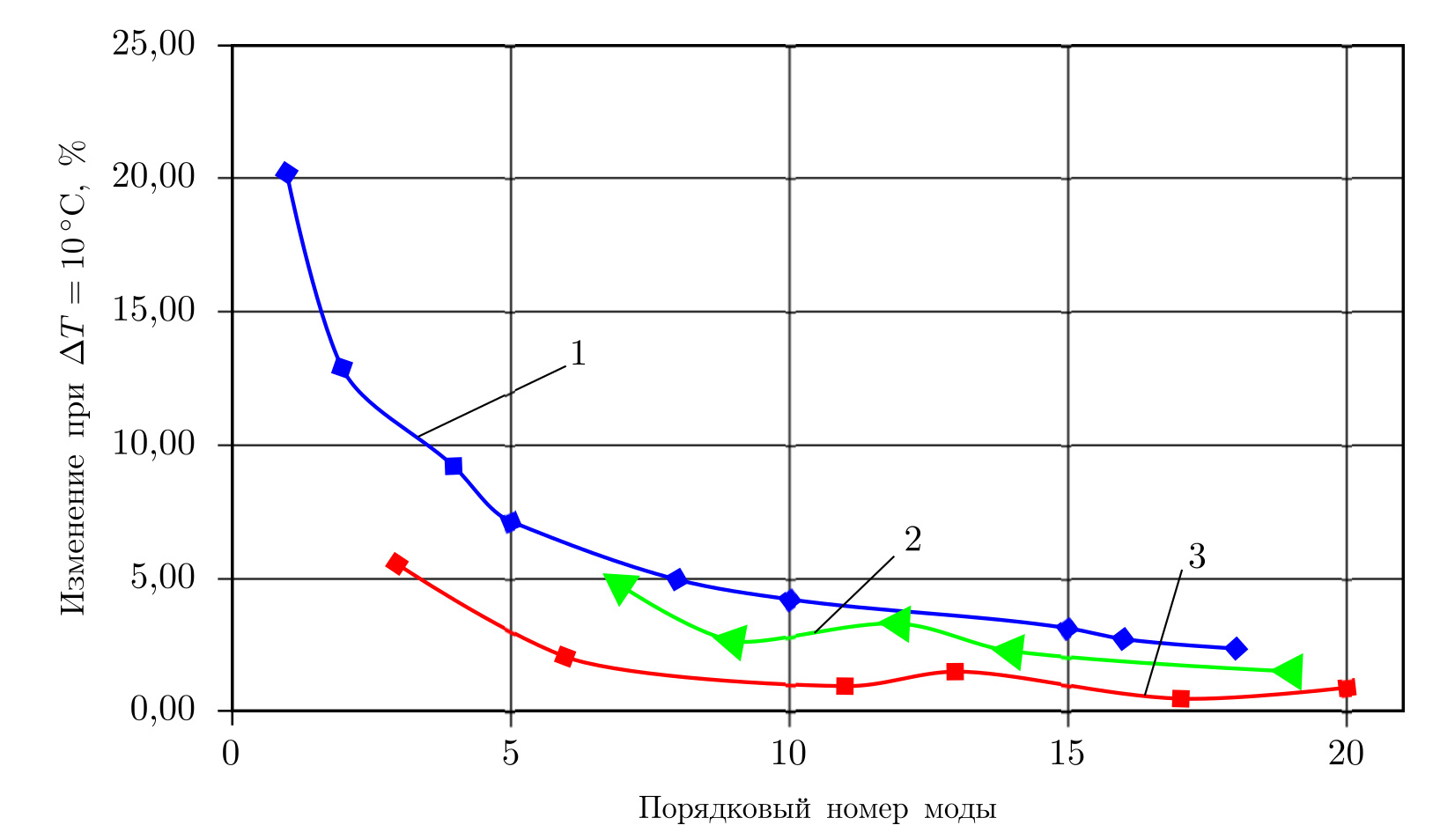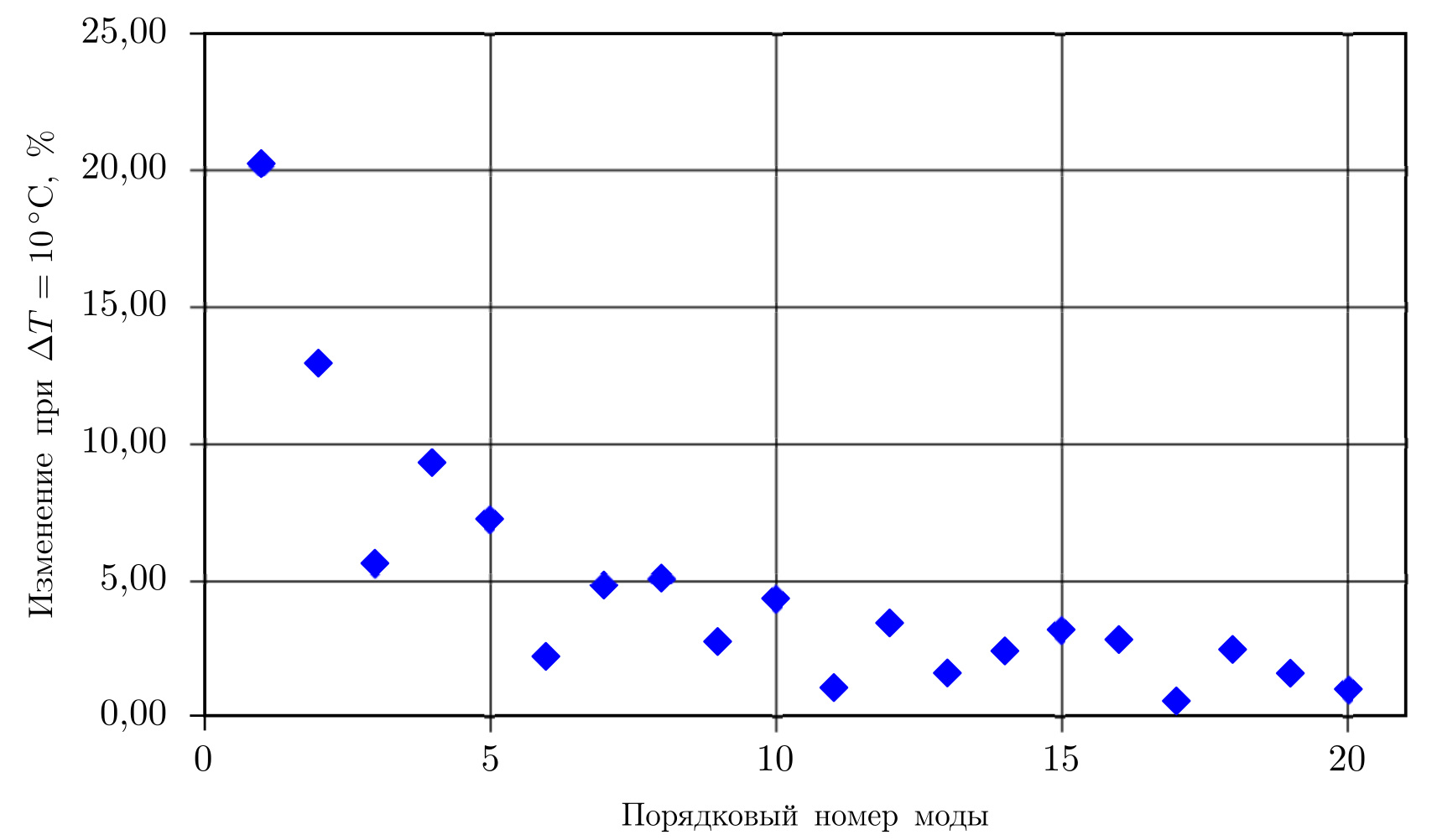 На рис. 2.4 точками показаны степени изменения мод при изменении температуры на 10 °С. По представленным данным видно, что изменение частоты идет неравномерно и зависит от порядкового номера моды. Кроме этого, замечено, что, поскольку одни моды с ростом температуры убывают быстрее других, при достижении определенных температур порядковые номера мод меняются.