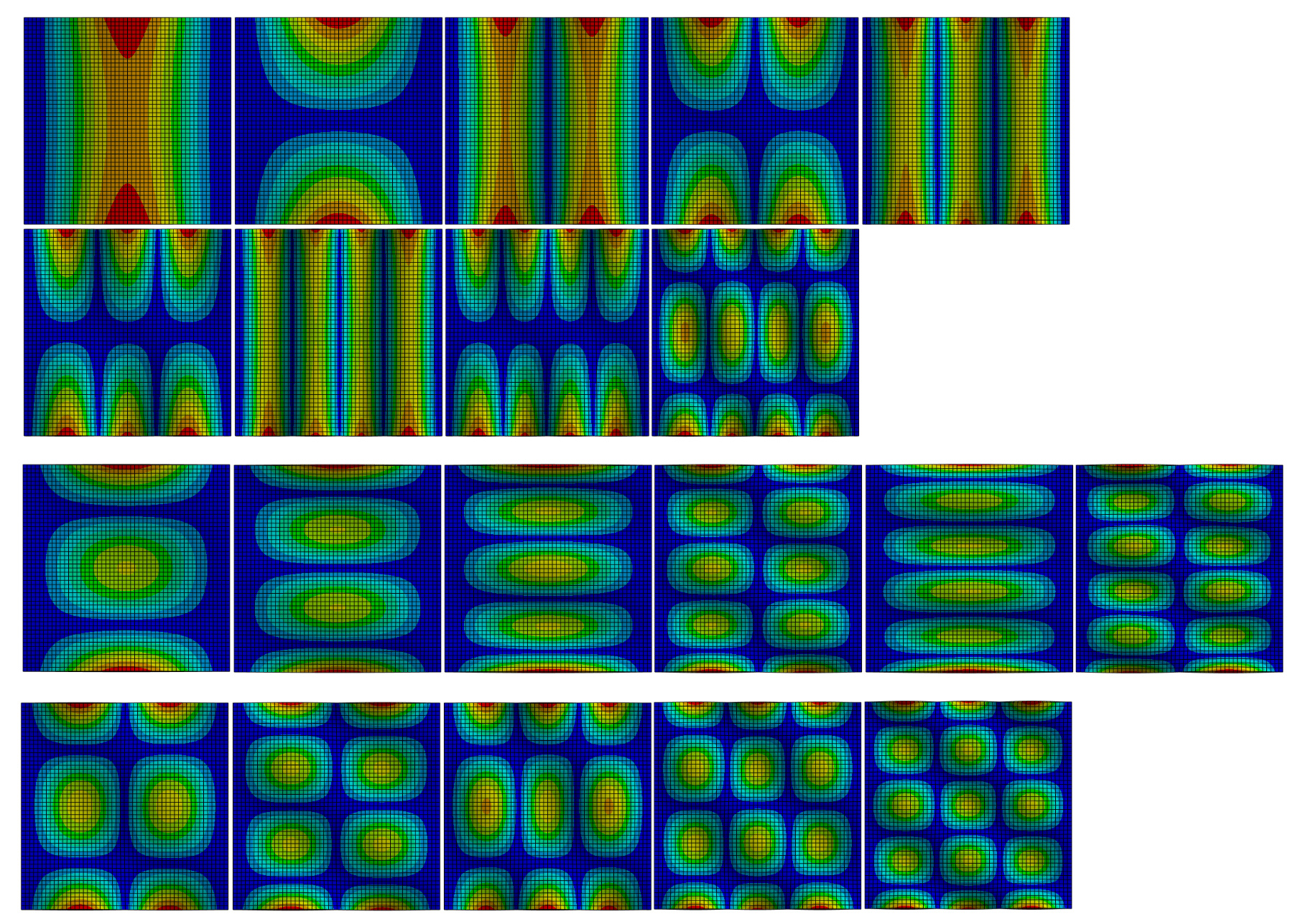 Дальнейшее повышение температуры приводит к исчезновению низших частот, а также к изменению форм колебаний. Результаты отображены на рис. 2.2 и 2.3.