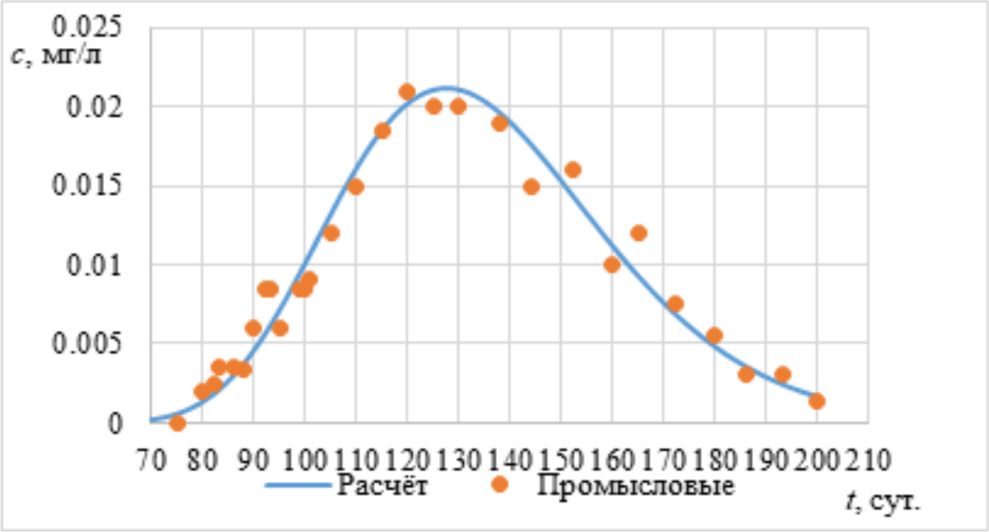 Валидация расчетных значений концентрации трассера с учетом определения коэффициента диссипации по методу градиентного спуска показала хорошее согласование с промысловыми данными (среднеквадратичные отклонения не превышают 7 %).