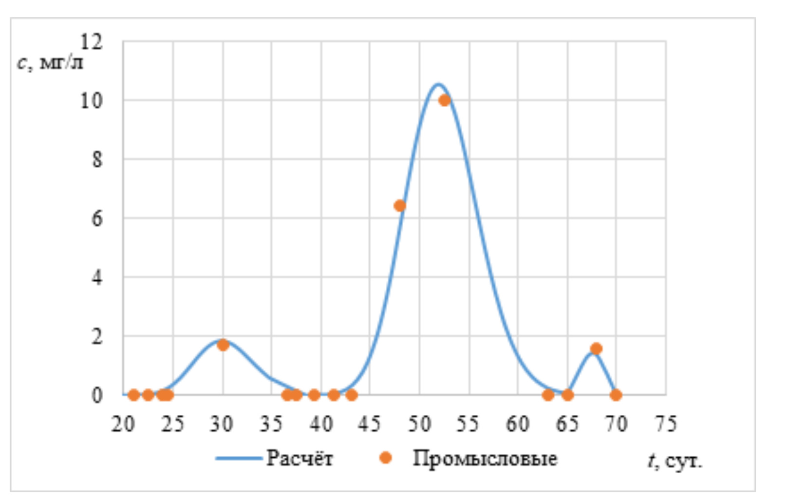 Рис. 4.1. Данные по выходу трассера в добывающей скважине 1076 при его закачке в ближайшую нагнетательную скважину 1074