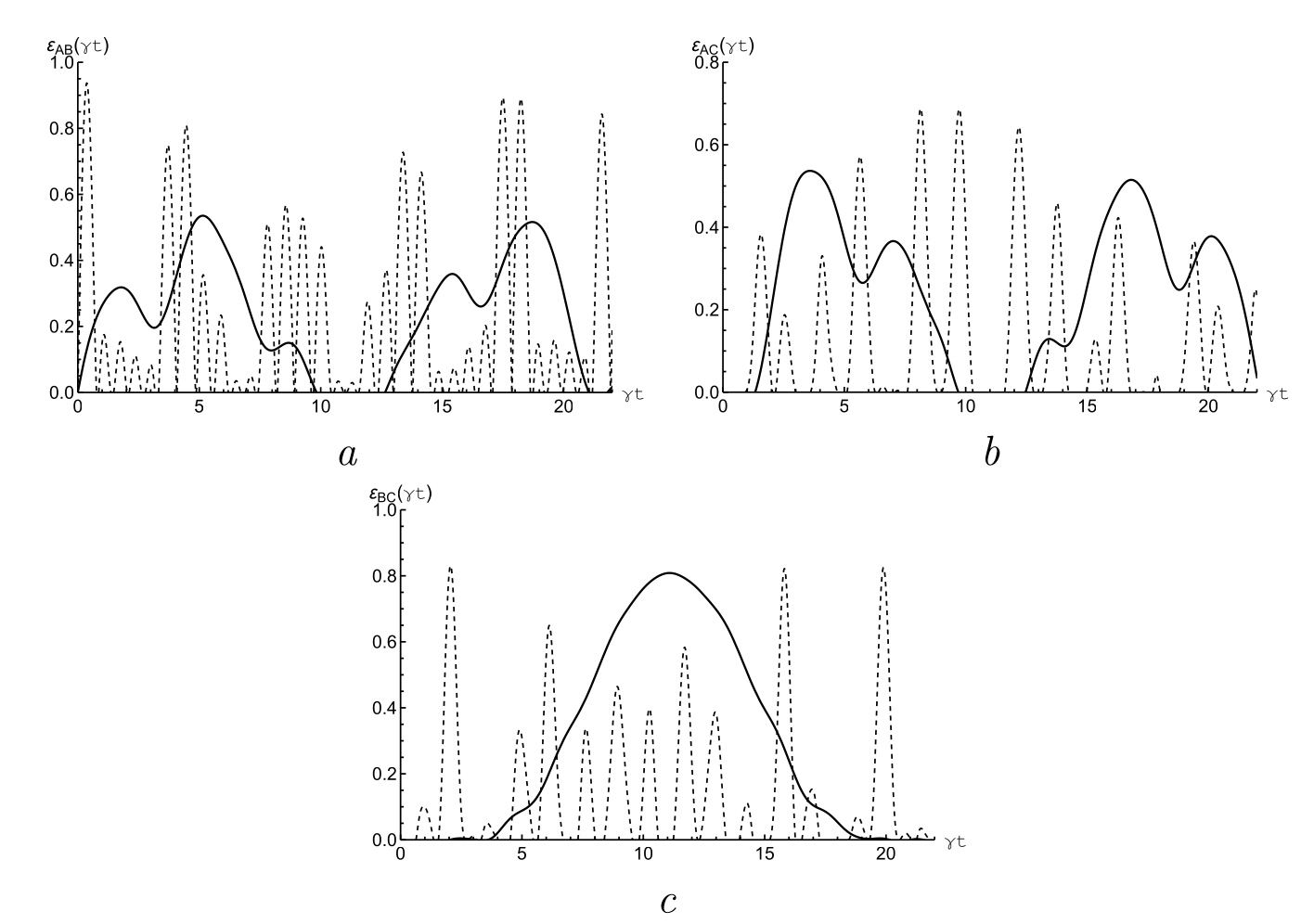 Рис. 4. Критерий отрицательности ( a), ( b) и ( c) построен как функция приведенного времени для начального бисепарабельного состояния вида (5). Среднее число тепловых фотонов . Константа диполь-дипольного взаимодействия : (черная сплошная линия), (красная пунктирная линия).