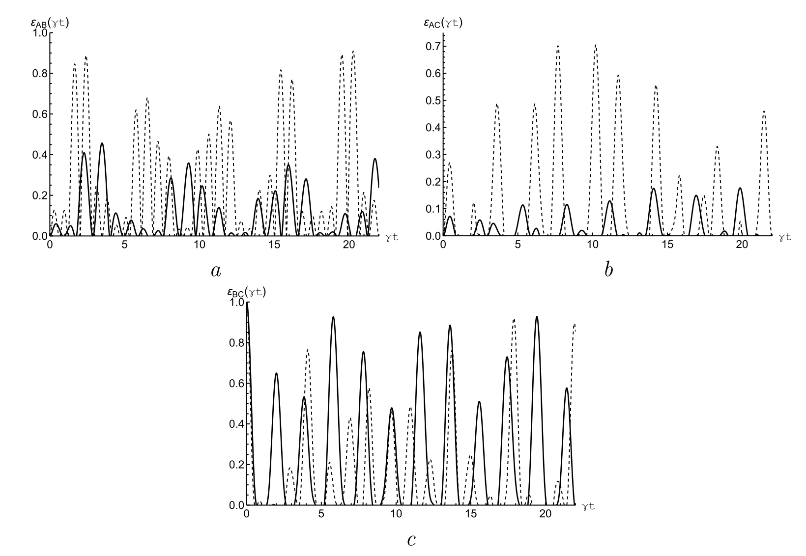 Для модели, изучаемой в настоящей статье, решения систем дифференциальных уравнений (10), (11) и (15), (16) имеют чрезмерно громоздкий вид. Поэтому в данной работе мы ограничимся численным решением указанных уравнений. Зная явный вид волновых функций (7), (8) и (12)–(14), мы можем вычислить временную матрицу плотности для полной системы, состоящей их трех кубитов и моды поля, по следующей формуле: