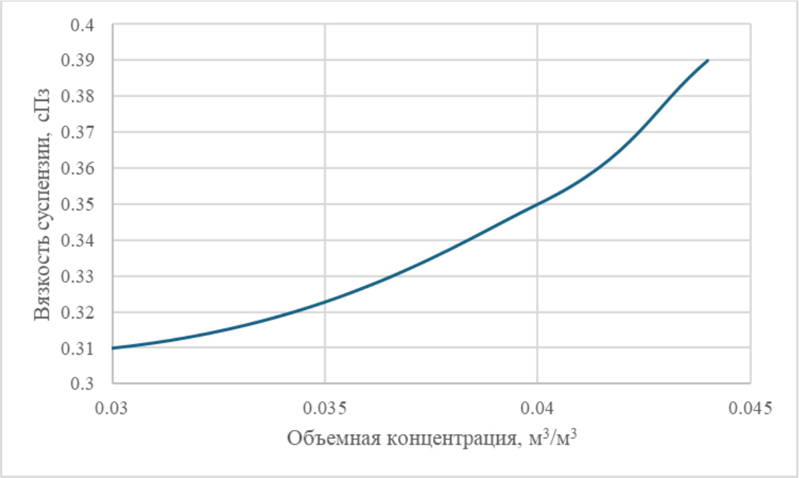 Используя зависимость вязкости раствора от концентрации полимера, указанной на рисунке 7, определено изменение вязкости закачиваемого раствора в динамике. Динамика изменения вязкости закачиваемого раствора отражена на рисунке 11. Анализ данной динамики свидетельствует о том, что, в процессе проведения обработки вязкость суспензии увеличивается, что, в свою очередь, позволяет снизить потери дисперсных частиц в пласт.