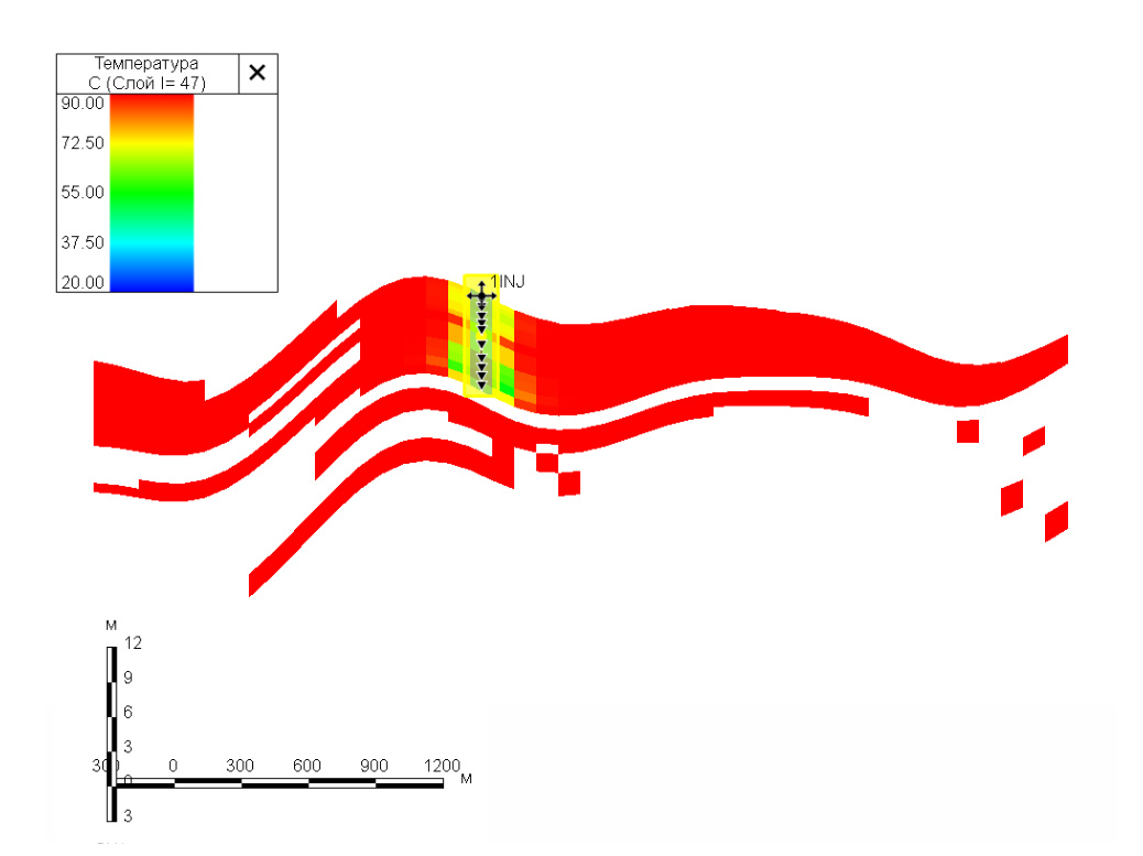 Исходя из полученных результатов можно сделать вывод, что утечки за пределы трещины автоГРП существуют, с учетом изменения температурного поля на забое нагнетательной скважины величина утечек относительно объема трещины незначительна. На рисунке 10 показано распределение пластовой температуры.