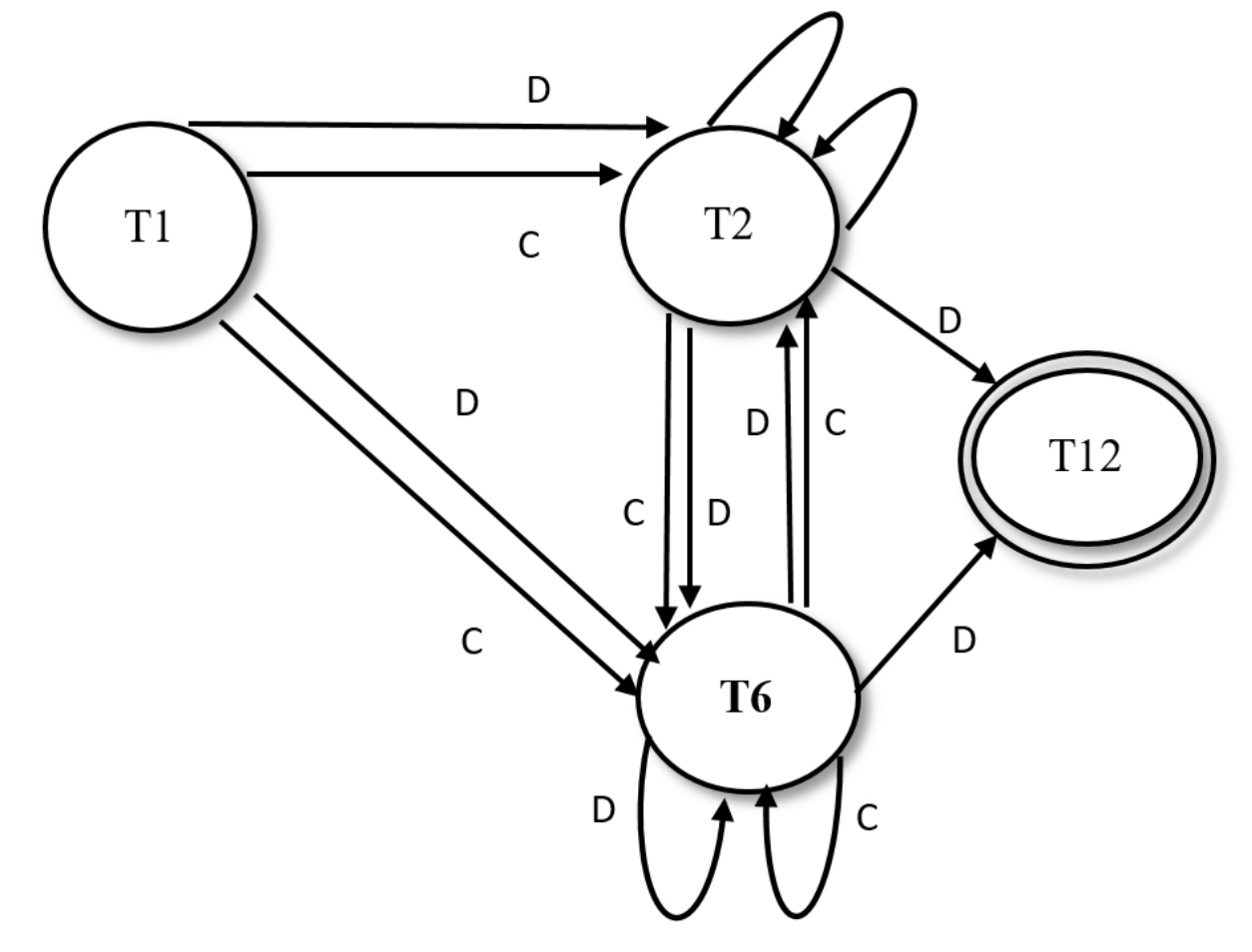 Модель взаимодействия приведена на рисунке 3. Отсутствие обратных дуг, обозначающих действие R, в данной модели обусловлено характером построения сценария при пассивном аудите (определяется наилучший сценарий атаки злоумышленника при учете того, что злоумышленнику известно все об атакуемой системе, средства защиты предустановлены, а система при этом изменяется только под действиями злоумышленника). В этом случае откат в предыдущее состояние означает отсутствие успеха в выбранной стратегии поведения злоумышленника, и, следовательно, возникает потребность в смене вектора атаки.