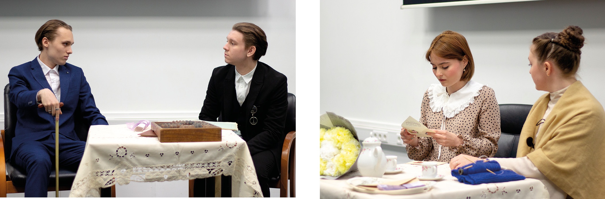 Сцены из пьесы «Таланты и поклонники» в исполнении студентов Университета Правительства Москвы (межкафедральный проект к 200-летию со дня рождения А. Н. Островского; фото А. Красавина, 2023 г.)