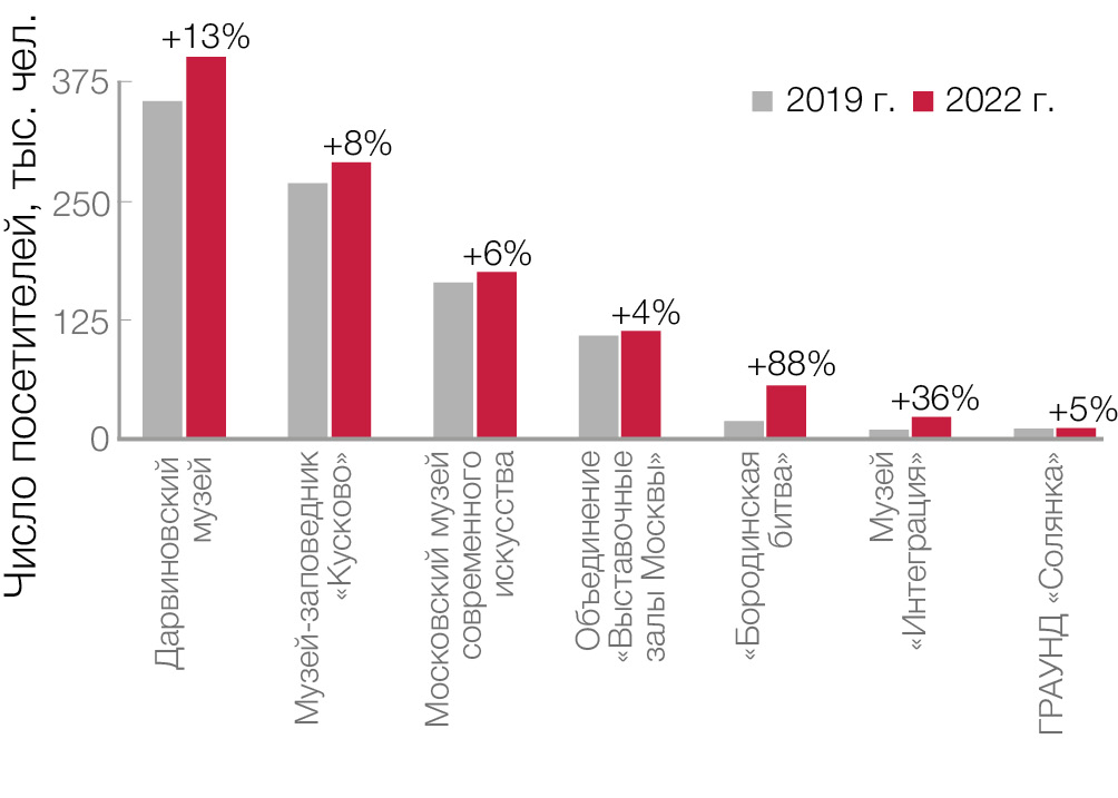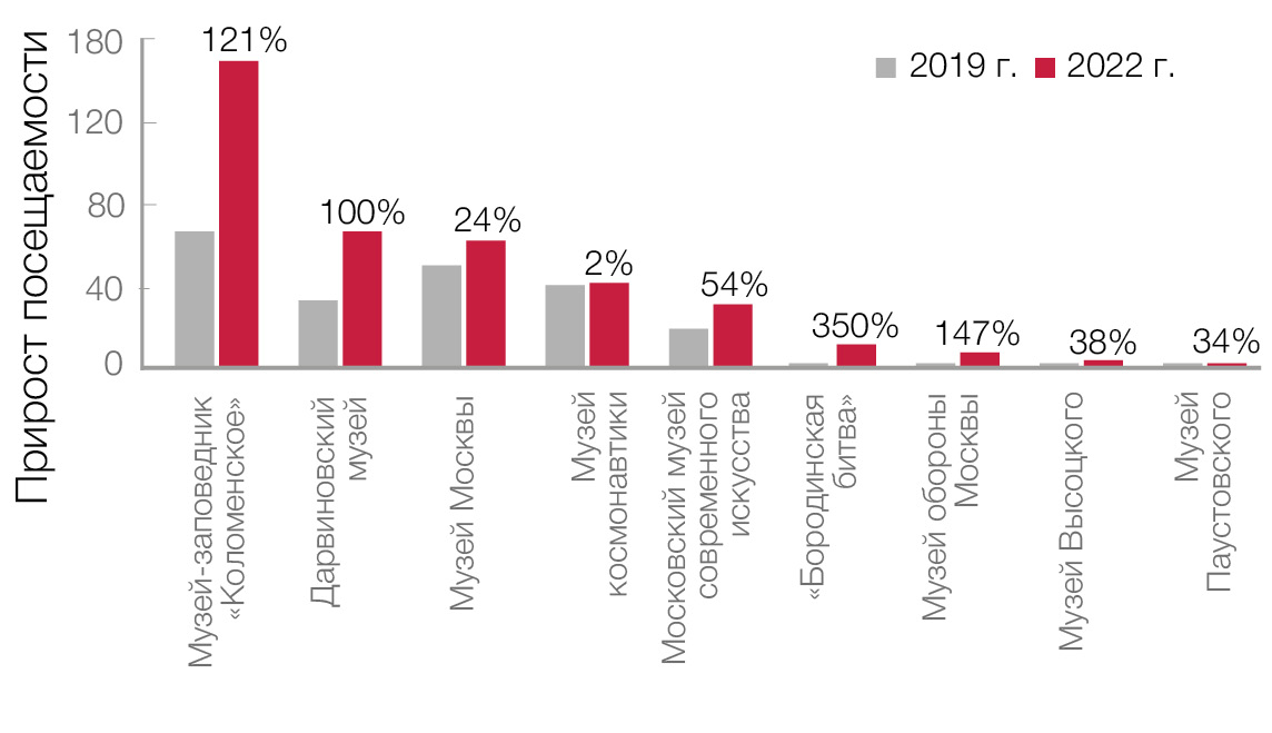 По мнению некоторых экспертов, возвращение показателей посещаемости для всей музейной отрасли к уровню 2019 г. могло занять до трех лет. По предварительным итогам 2022 г., прогнозный показатель посещаемости в прошедшем году составляет около 16 млн человек. Эти данные вселяют уверенность, что в 2023 г. прирост посещаемости продолжится.