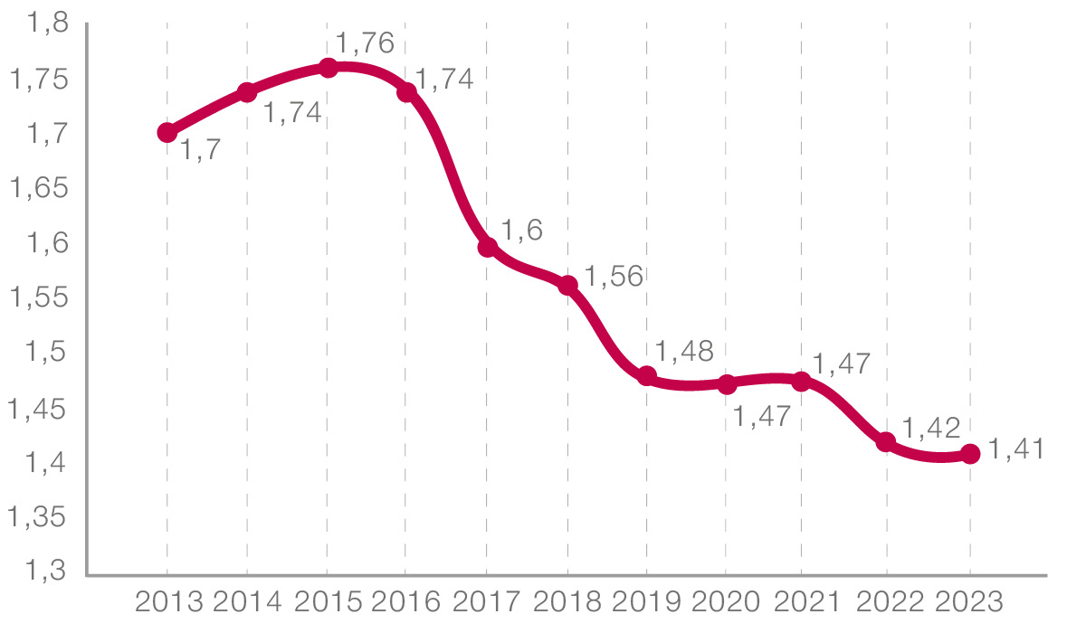 Нынешнюю российскую демографическую ситуацию отличает интересный факт. Рождаемость в стране за последние 20 лет сократилась на 20%. Так, коэффициент рождаемости в 2023 г. составил 1,41 ребенка на одну женщину на протяжении всего репродуктивного периода (максимум был в 2015 г. – 1,78; рис. 1).