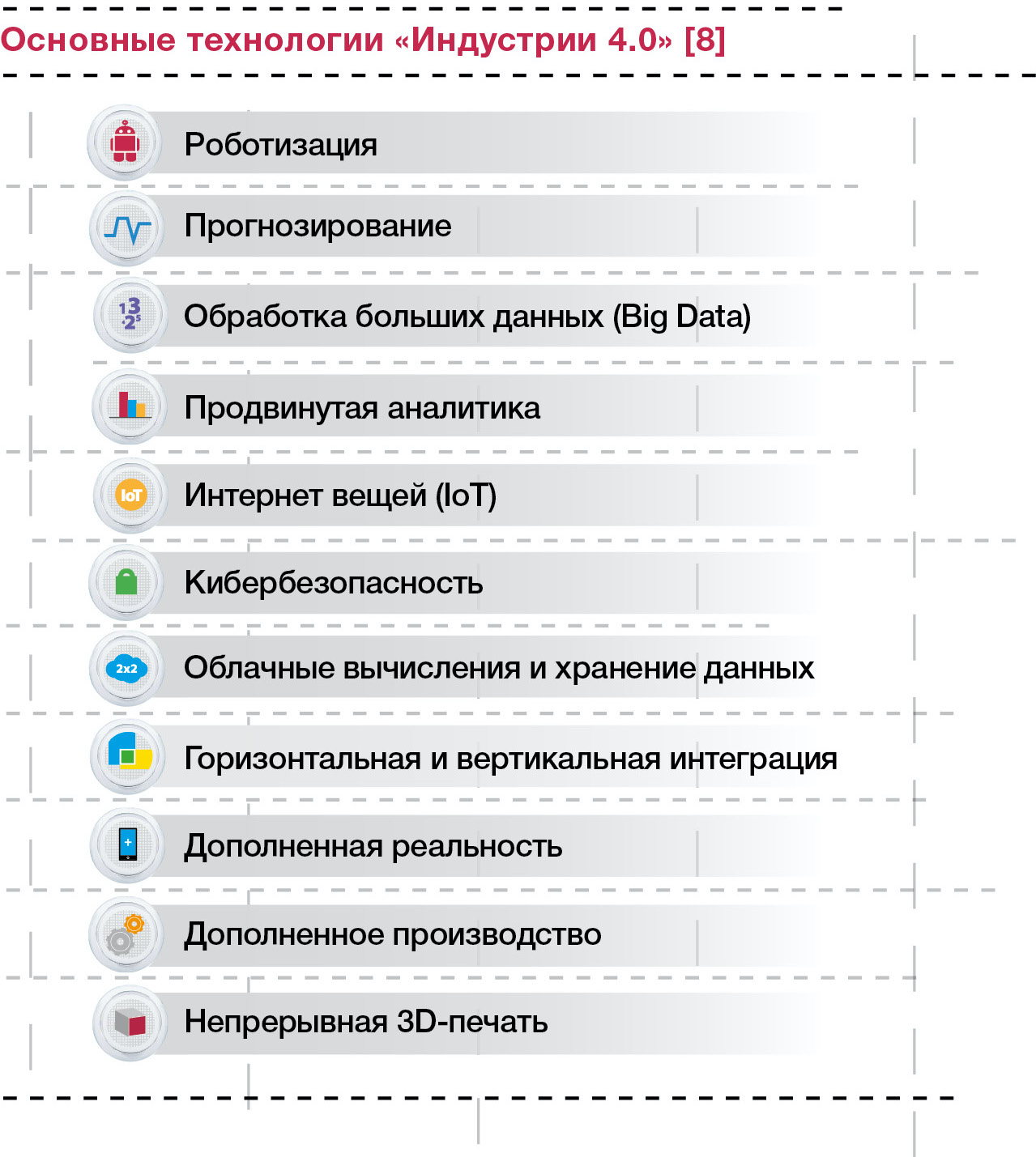 Управление инвестиционными проектами, в том числе в рамках цифровизации, на региональном уровне сочетается с управлением социально-экономическим развитием. Сегодня это актуальная задача для государства. Однако основные технологии «Индустрии 4.0» (рис. 1) недостаточно освещены в научно-практической литературе и программных стратегических документах. На наш взгляд, разработка и широкое внедрение этих технологий требуют прежде всего целенаправленного анализа возможностей и перспектив их применения на местах.