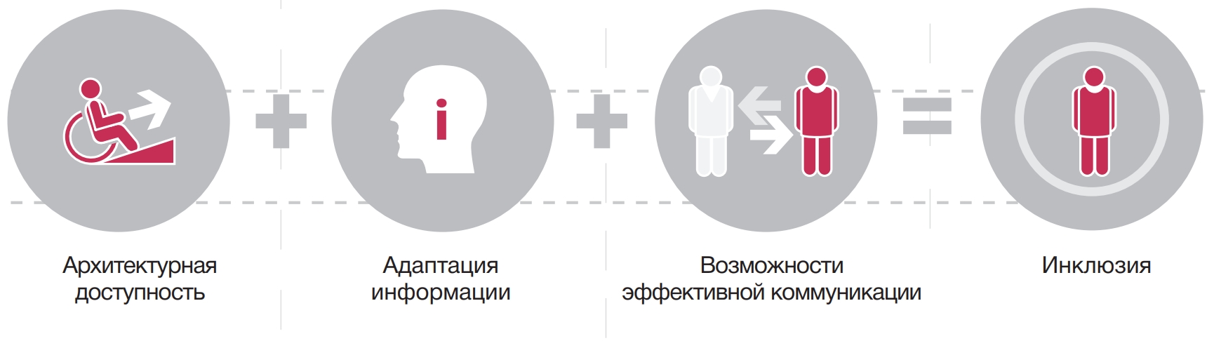 Современный музей – это общественное пространство, посетителями которого могут быть люди, принадлежащие к различным социальным категориям: родители с грудными детьми, подростки, студенты, пожилые люди, люди с инвалидностью, люди, говорящие на разных языках. Задача современного музея – сделать так, чтобы для каждого человека визит сюда был комфортным и безопасным. Нередко представление об инклюзии соотносят исключительно с темой инвалидности. Однако этот термин, на наш взгляд, следует трактовать шире. Инклюзия – полноценное приятие любого посетителя общественного заведения, процесс построения диалога с ним и создание атмосферы для комфортного общения (рис. 1). В такой обстановке возникают благоприятные условия для формирования новых смыслов при посещении музея, выставки, иной экспозиции и реализуются многие потенциально доступные возможности.