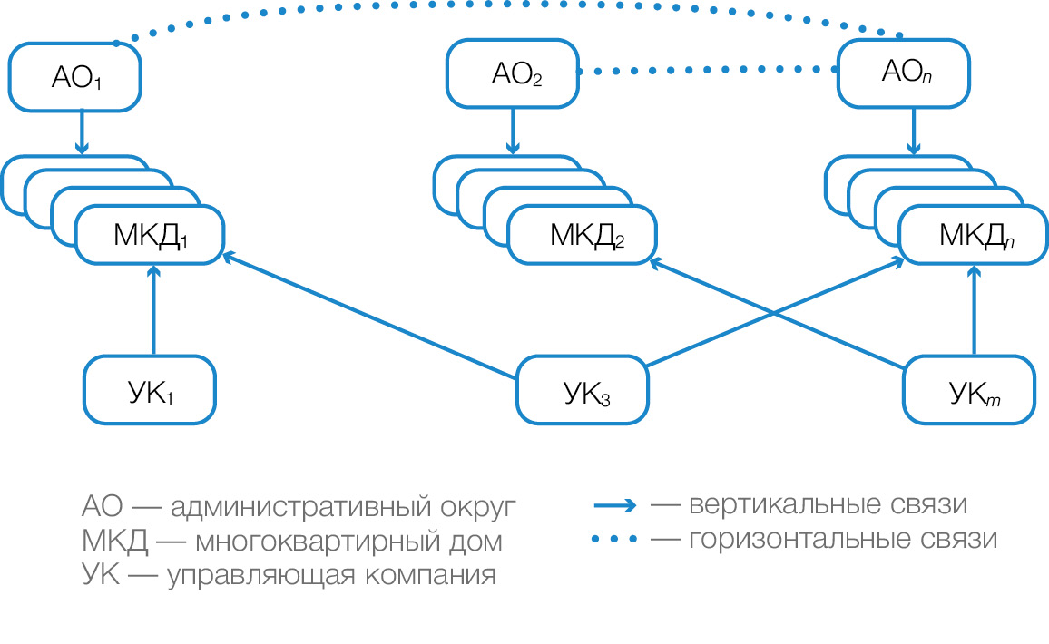В 2020 г. в Москве насчитывалось 605 управляющих организаций [9], в ведении которых находилось 31 119 многоквартирных домов (МКД) суммарной площадью 247 365 583 кв. м. Имеется территориальное деление многоквартирных домов по административным округам, и управление жилищным фондом берут на себя различные управляющие компании. Большинство их по сложившейся практике управления отвечают за несколько МКД, а в ведении некоторых находятся МКД, расположенные в разных административных округах. Таким образом, возникает сложная структура вертикальных связей, объединяющих МКД и административные округа, а также управляющие компании и МКД. В то же время между административными округами возникают и горизонтальные связи, когда одна и та же управляющая организация отвечает за МКД из разных административных округов (рис. 1).