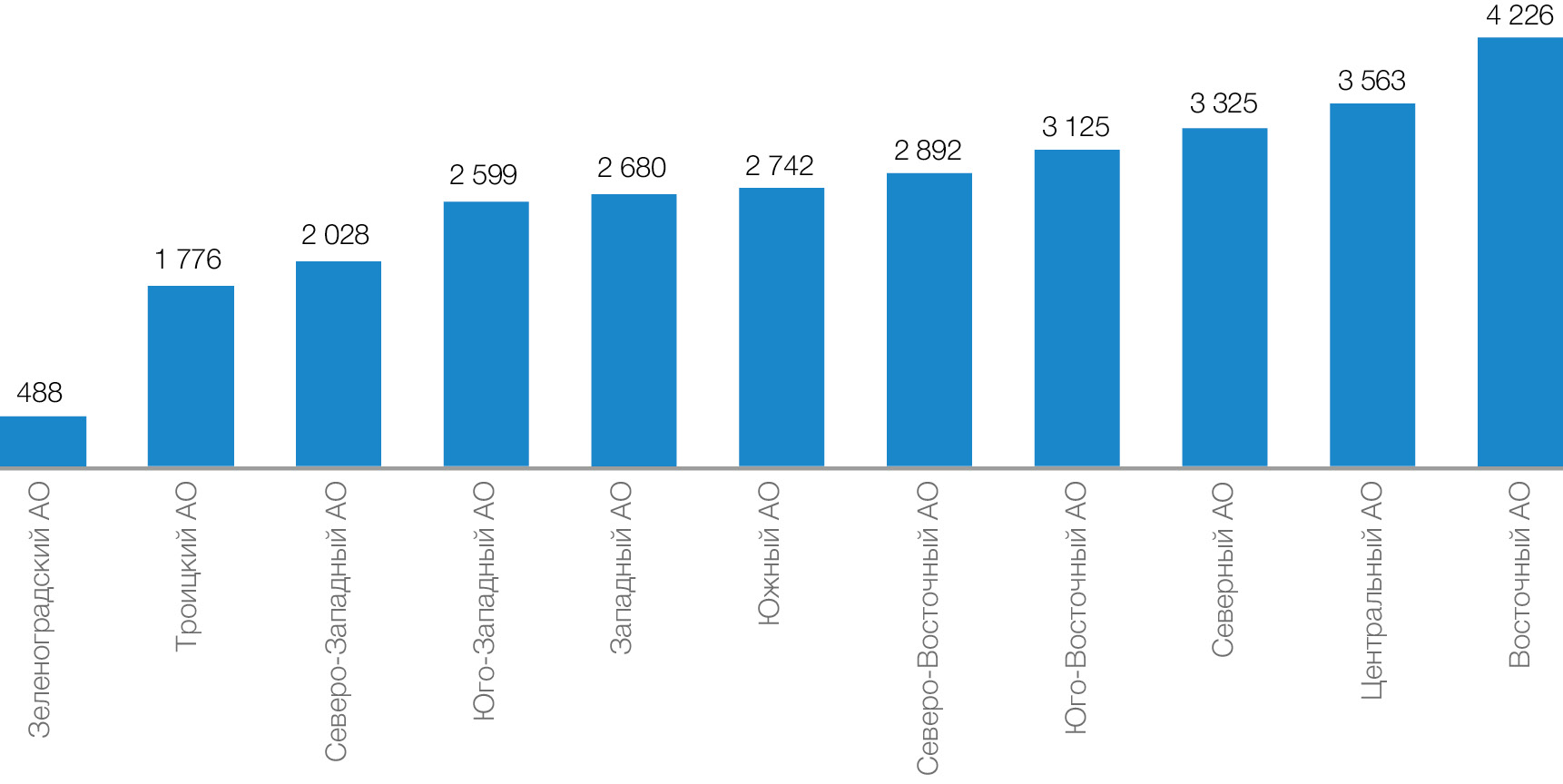 Рис. 3 Количество МКД, находящихся в управлении, в различных административных округах Москвы