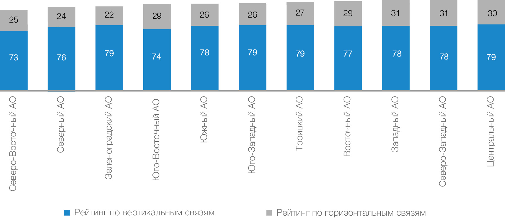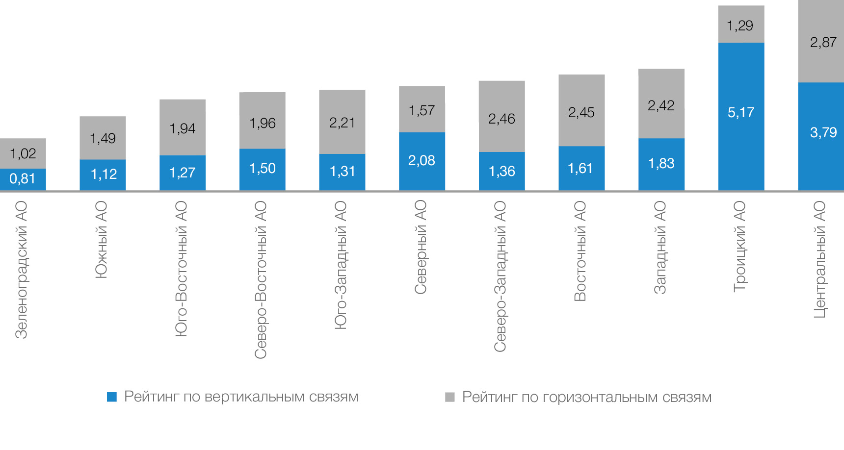 Поскольку влияние управляющих компаний через горизонтальные связи незначительно, допустимо начать формирование рейтинга административных округов с учета вертикальных связей. При оценке можно следовать в одном из двух направлений: