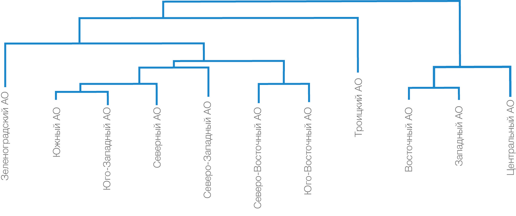 Для проведения кластеризации были выбраны частные показатели результативности, представленные на рисунках 5–8, причем отдельно учитывались соответствующие показатели, характеризующие вертикальные и горизонтальные связи (итого восемь частных показателей). На рисунке 9 показан итог иерархической кластеризации административных округов. Кластеризация выполнялась на основе агломеративного алгоритма, т. е. снизу вверх: анализируемые объекты (административные округа) объединяются во все более крупные группы. Полученный агломеративный коэффициент, характеризующий качество кластерной структуры, имеет сравнительно низкое значение (0,65). Это означает, что результат кластеризации адекватен поставленной задаче.
