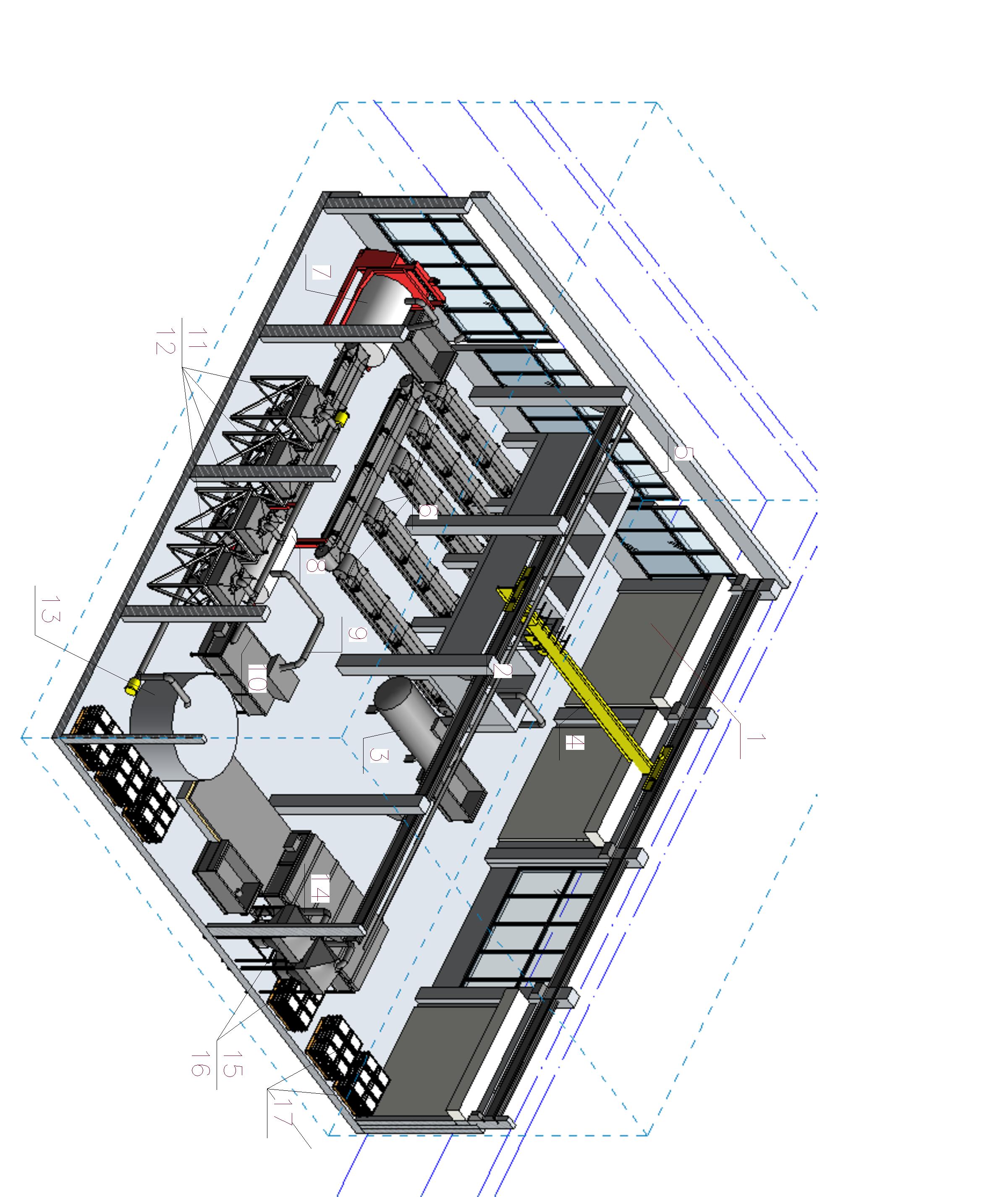 1 – ворота для привоза исходных компонентов; 2 – приёмный бункер торфа; 3 – установка пиролиза; 4 – кран-балка; 5 – бункеры исходных материалов; 6 – ленточные конвейеры; 7 – барабанная сушилка; 8 − шаровая мельница; 9 – шнековый транспортер; 10 – вибросито; 11 – бункеры размолотых компонентов; 12 – дозаторы весовые; 13 – смеситель принудительного действия; 14 – электропечь с выкатным подом; 15 – бункеры готовой продукции; 16 – узел вторичного размола и упаковки; 17 – склад готовой продукции