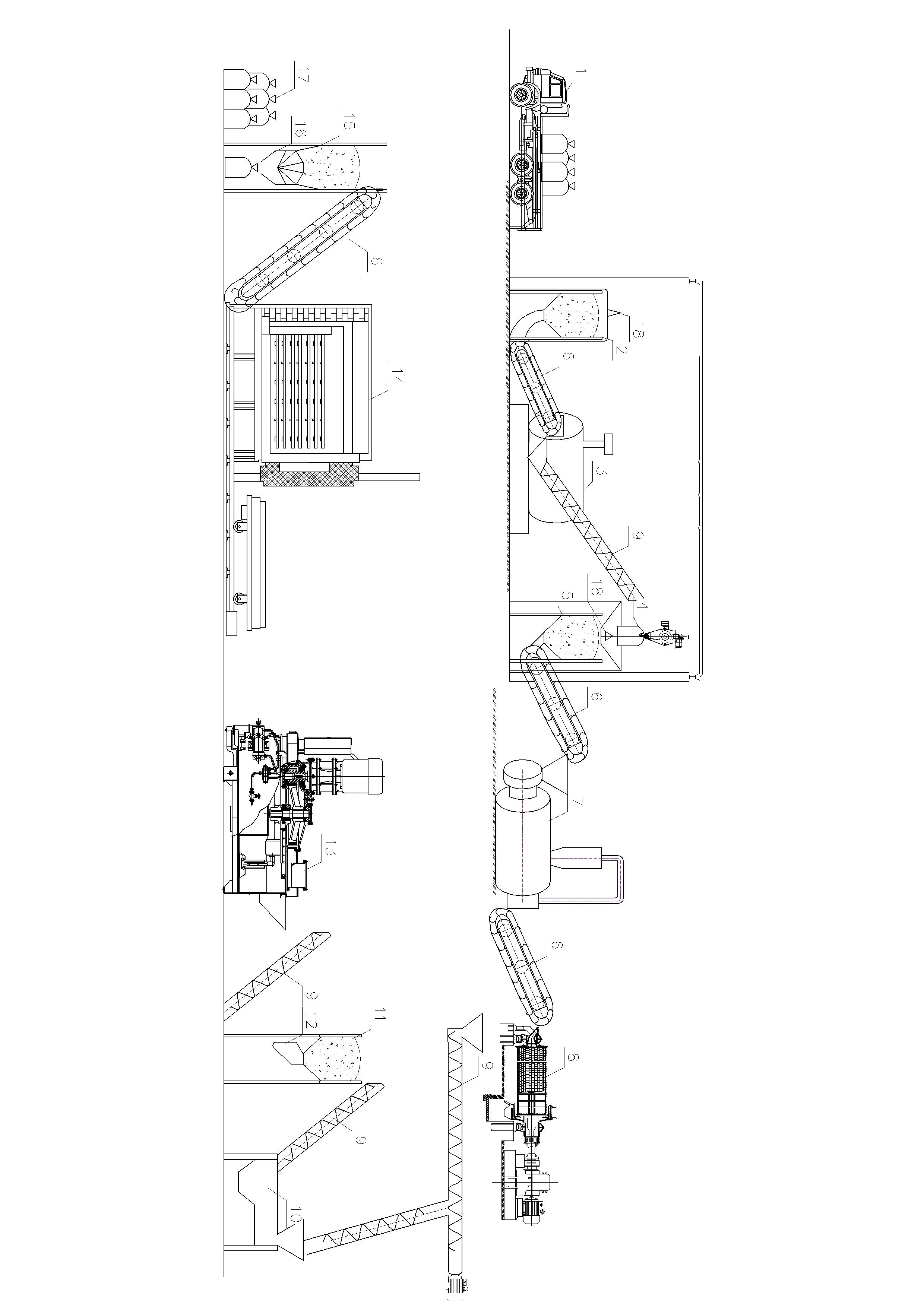 1 – привоз исходных компонентов; 2 – приёмный бункер торфа; 3 – установка пиролиза; 4 – кран-балка; 5 – бункеры исходных материалов; 6 – ленточные конвейеры; 7 – барабанная сушилка; 8 – шаровая мельница; 9 – шнековый транспортер; 10 – вибросито; 11 – бункеры размолотых компонентов; 12 – дозаторы весовые; 13 – смеситель принудительного действия; 14 – электропечь с выкатным подом; 15 – бункеры готовой продукции; 16 – узел вторичного размола и упаковки; 17 – склад готовой продукции; 18 – растариватель «Биг-Бэгов»