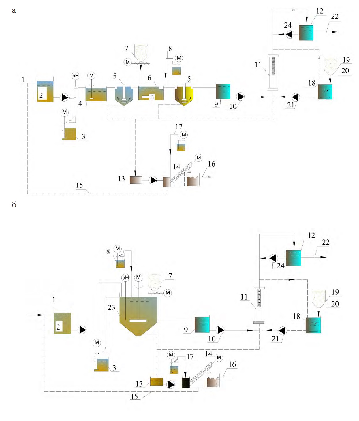 1 – исходные сточные воды; 2 – усреднитель; 3 – установка приготовления и дозирования раствора щелочи; 4 – реактор-нейтрализатор; 5 – отстойник; 6 – адсорбер-смеситель; 7 – дозатор сорбента; 8 – установка приготовления и дозирования коагулянта; 9 – промежуточный бак; 10 – насос подачи на фильтр; 11 – намывной фильтр; 12 – бак очищенной воды; 13 – бак осадка; 14 – установка механического обезвоживания; 15 – фильтрат установки обезвоживания; 16 – обезвоженный осадок; 17 – установка приготовления и дозирования флокулянта; 18 – бак приготовления намывной суспензии; 19 – бункер для перлита; 20 – секционный дозатор перлита; 21 – насос для намыва перлита; 22 – очищенные сточные воды; 23 – реактор-отстойник; 24 – насос обратной промывки