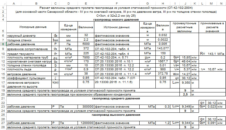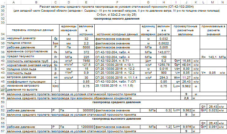 Последовательность расчетов определяется логической цепочкой, учитывающей исходные проектные данные (рабочее давление в газопроводе, материал, диаметр, толщину стенки, климатический район строительства и т. д.) Для схематического представления алгоритма расчета величин средних пролетов между опорами надземных газопроводов для различных климатических условий составлена блок-схема, которая затем была применена в электронных таблицах Microsoft Excel.