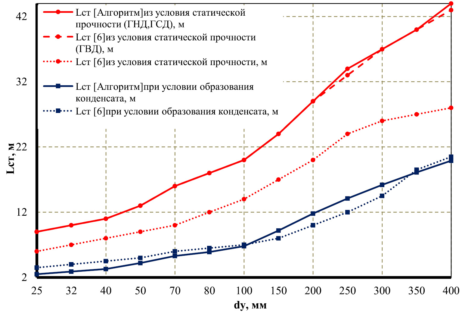 Авторами проведены расчеты величин средних пролетов газопровода из условия статической прочности для транспортировки осушенного природного газа согласно СП 42-102-2004 и для транспортировки газа, в котором возможно образование конденсата для двух вариантов:
