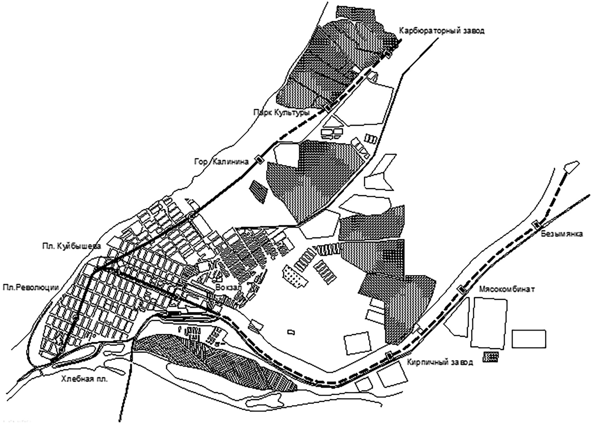 - Хлебная площадь – Площадь Революции – Площадь Куйбышева – Вокзал и вдоль железнодорожного пути до станции Безымянка с остановками у Толевого завода и Мясокомбината.