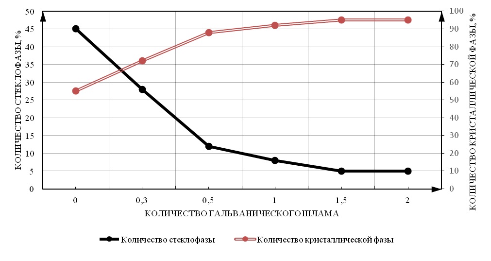 Оптимальное количество гальванического шлама от общей массы смеси составляет 0,5−1,5 %. Такое количество гальваношлама обеспечивает практически полную кристаллизацию стекломассы при температуре спекания 700 °С и длительности 90 мин.